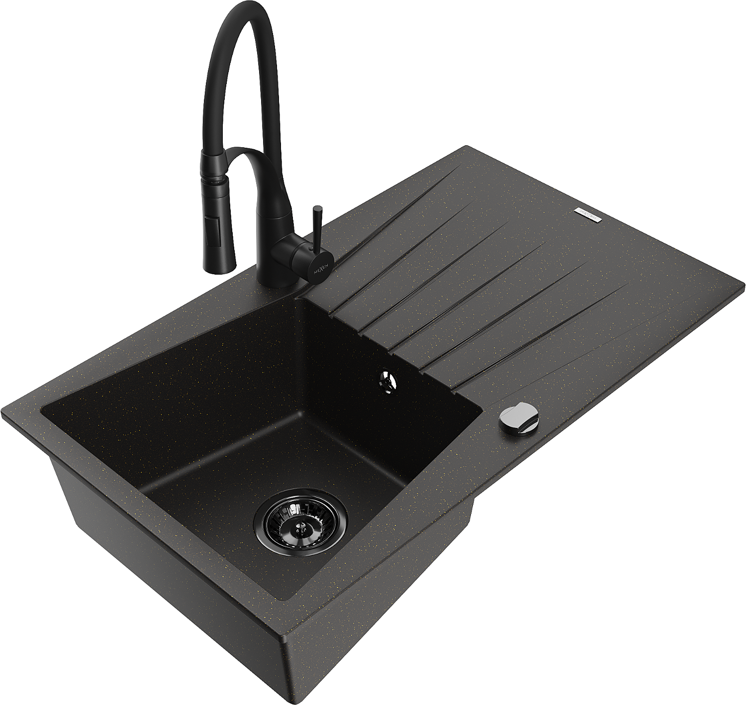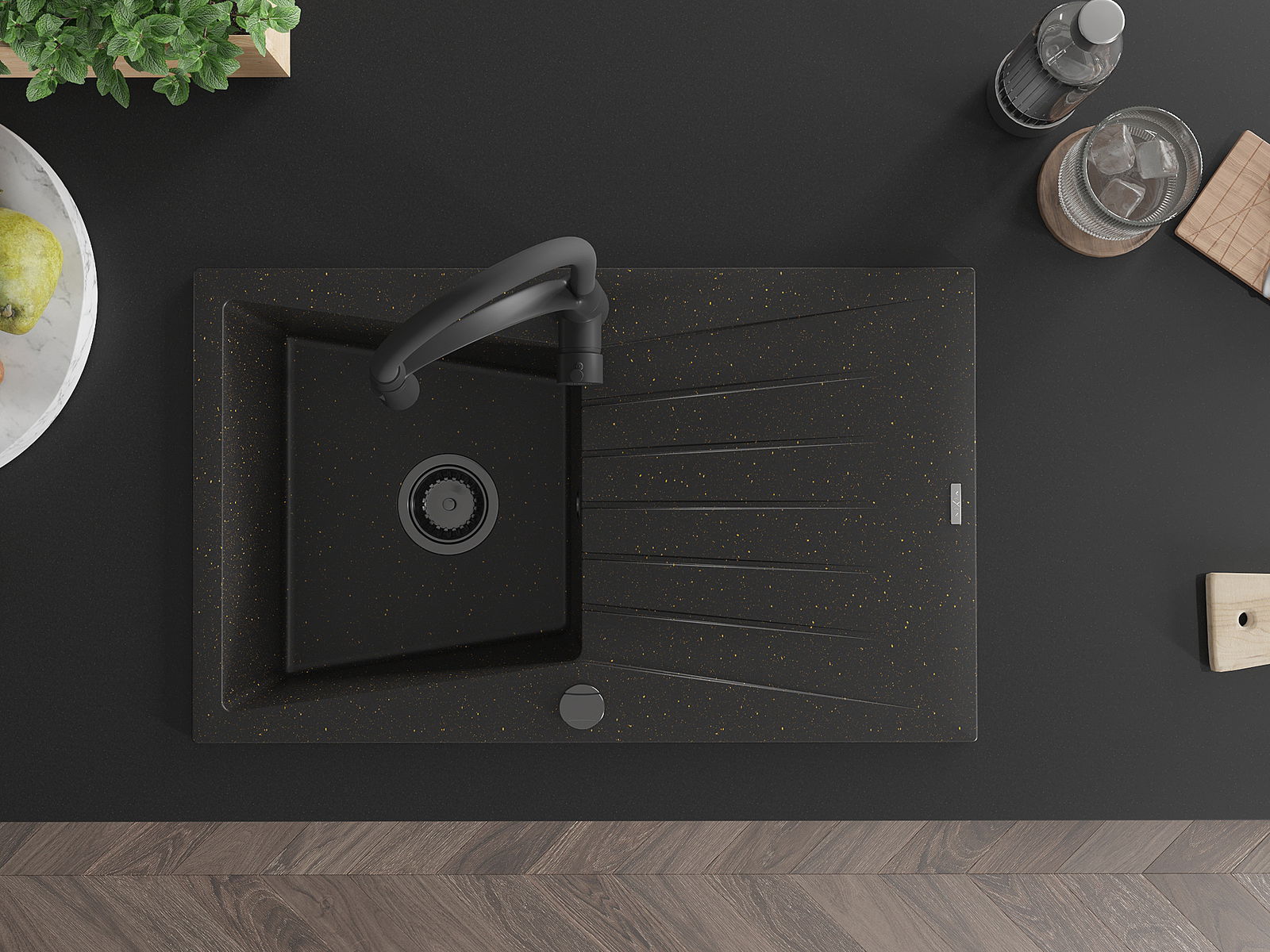 Mexen Cesar évier en granit 1 bac avec égouttoir et robinet de cuisine Aster, noir/métallisé doré - 6514-75-73450-70-B