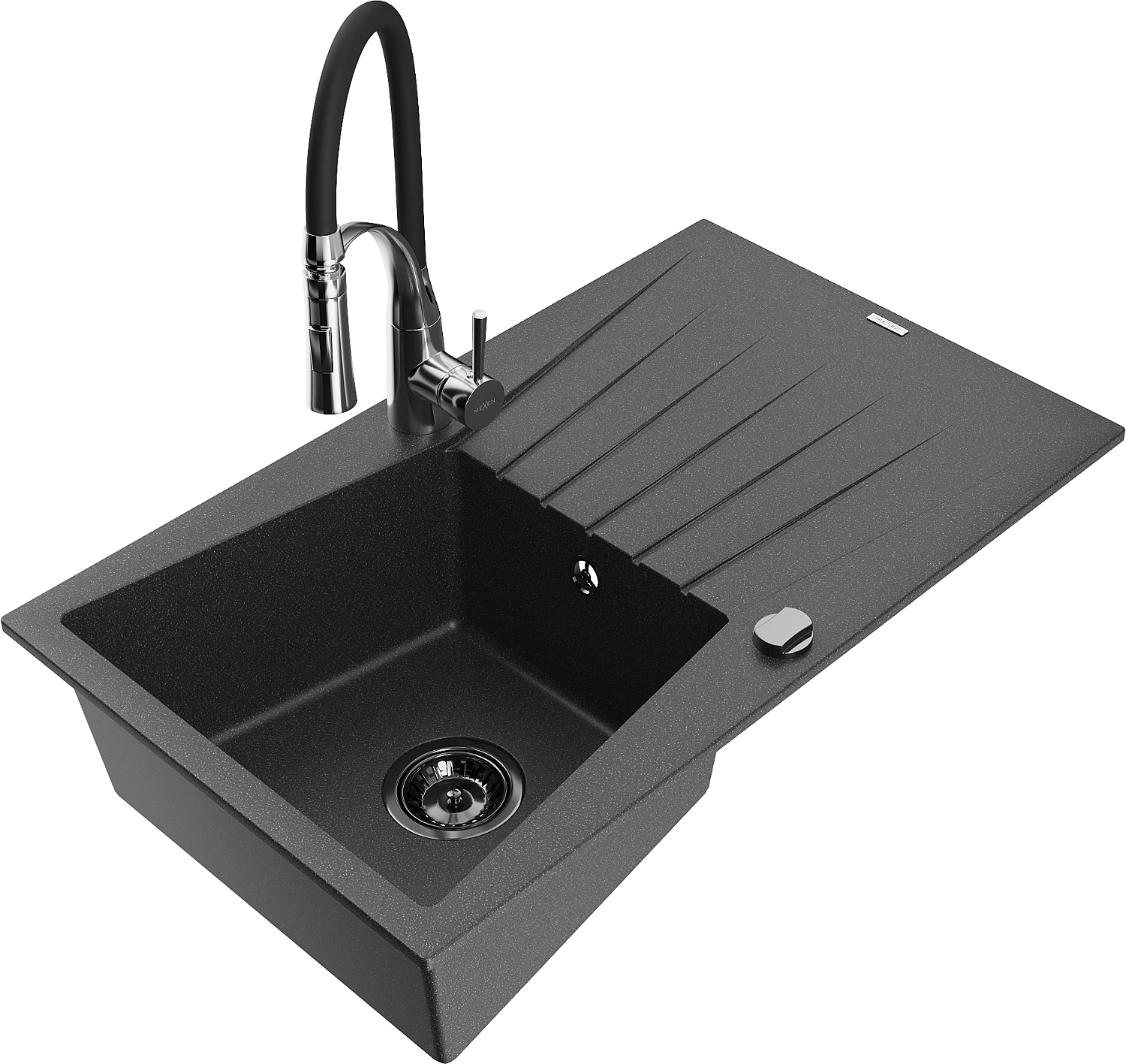Mexen Cesar évier en granit 1 bac avec égouttoir et robinet de cuisine Aster, noir moucheté - 6514-76-73450-07-B