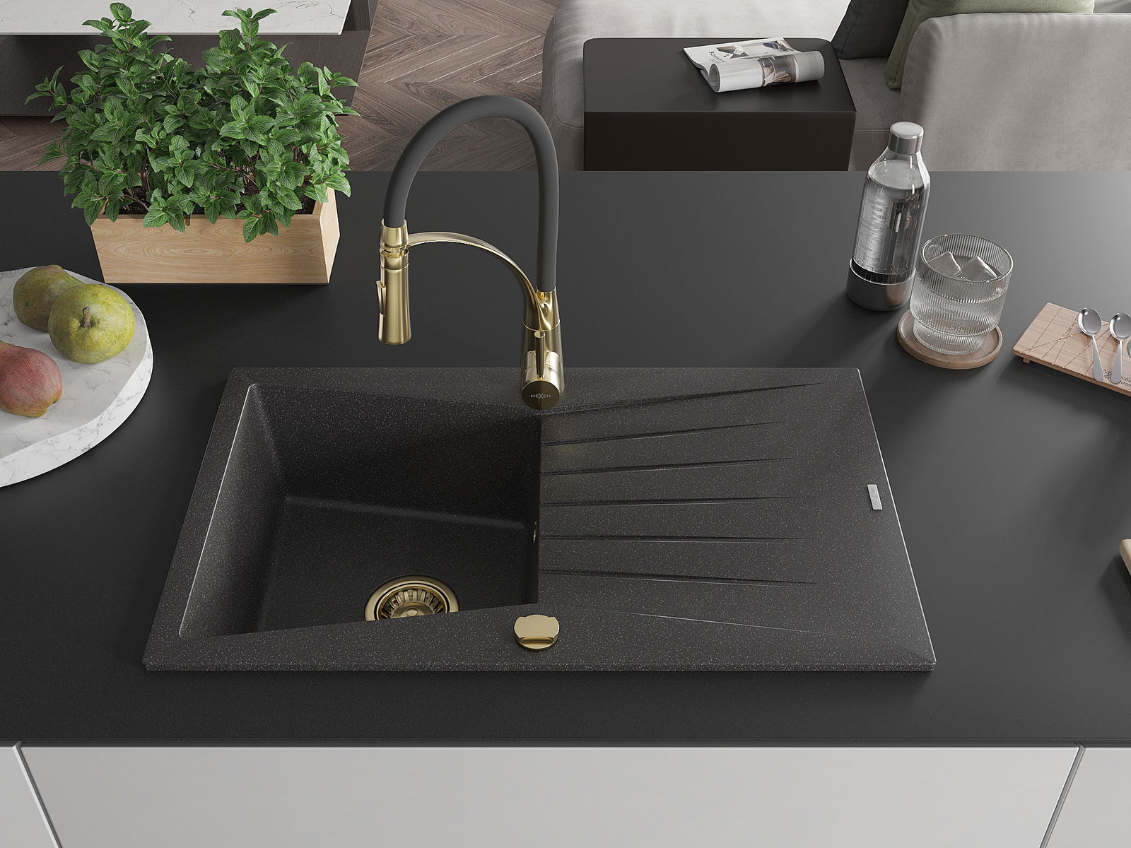 Mexen Cesar évier granit 1-bac avec égouttoir et robinet de cuisine Aster, noir tacheté - 6514-76-73450-57-G