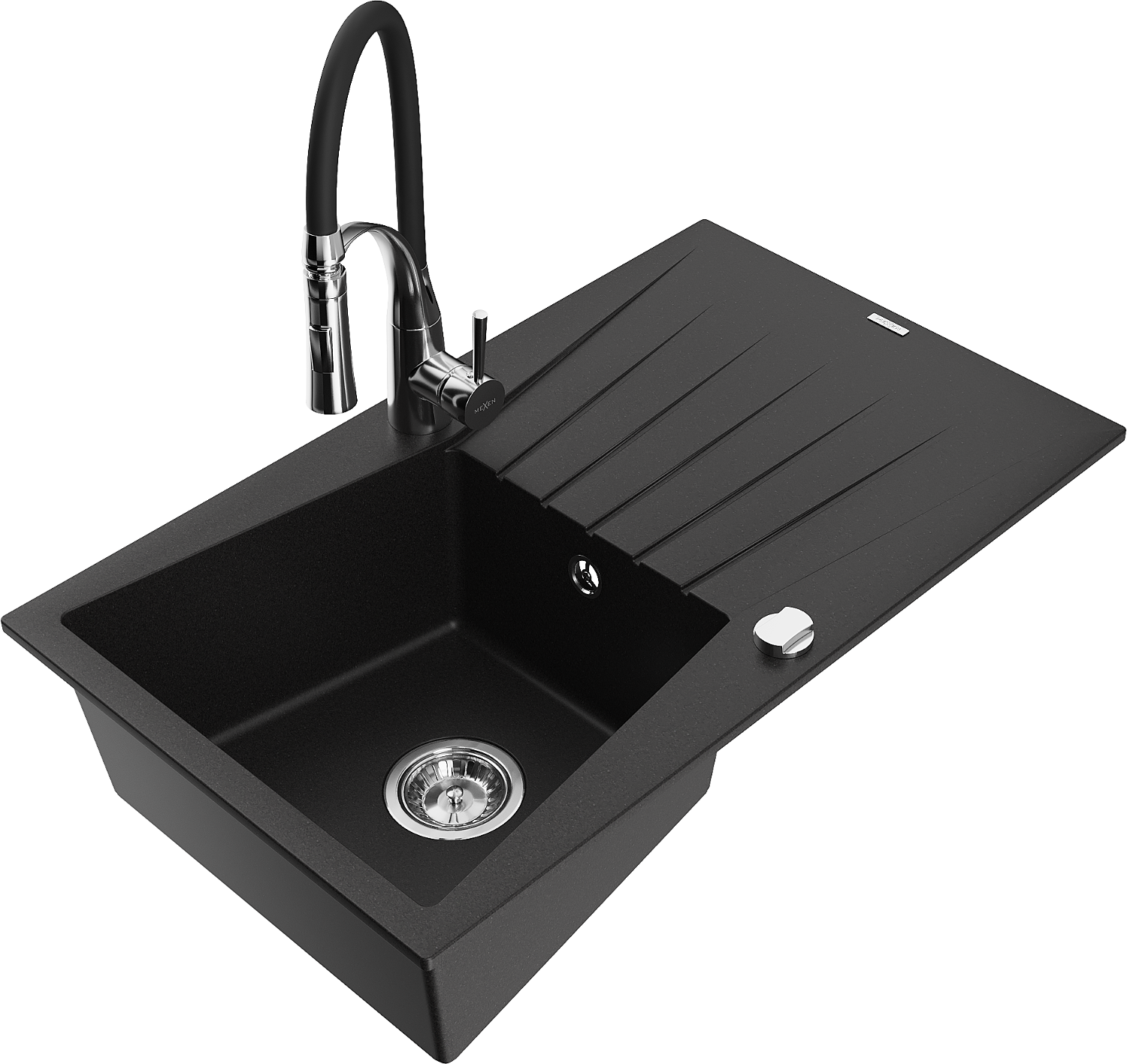Mexen Cesar évier en granit 1 cuve avec égouttoir et robinet de cuisine Aster, noir - 6514-77-73450-07