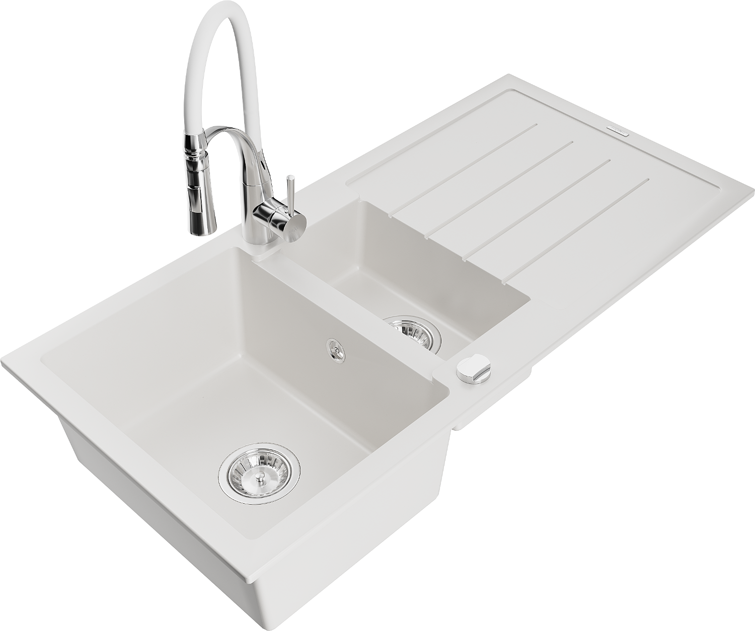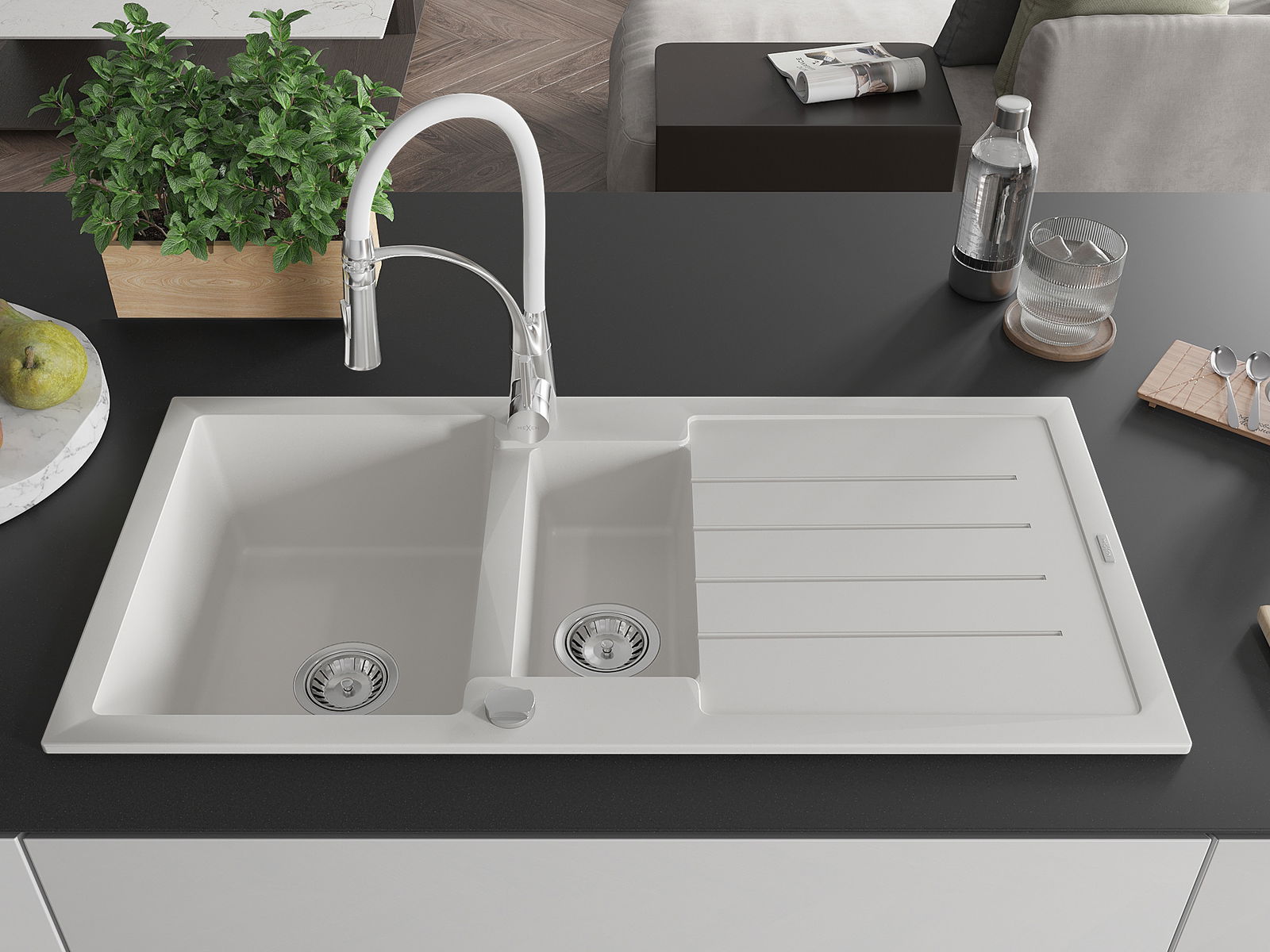 Mexen Andres évier en granit 1,5 bac avec égouttoir et robinet de cuisine Aster, blanc - 6515-20-73450-02
