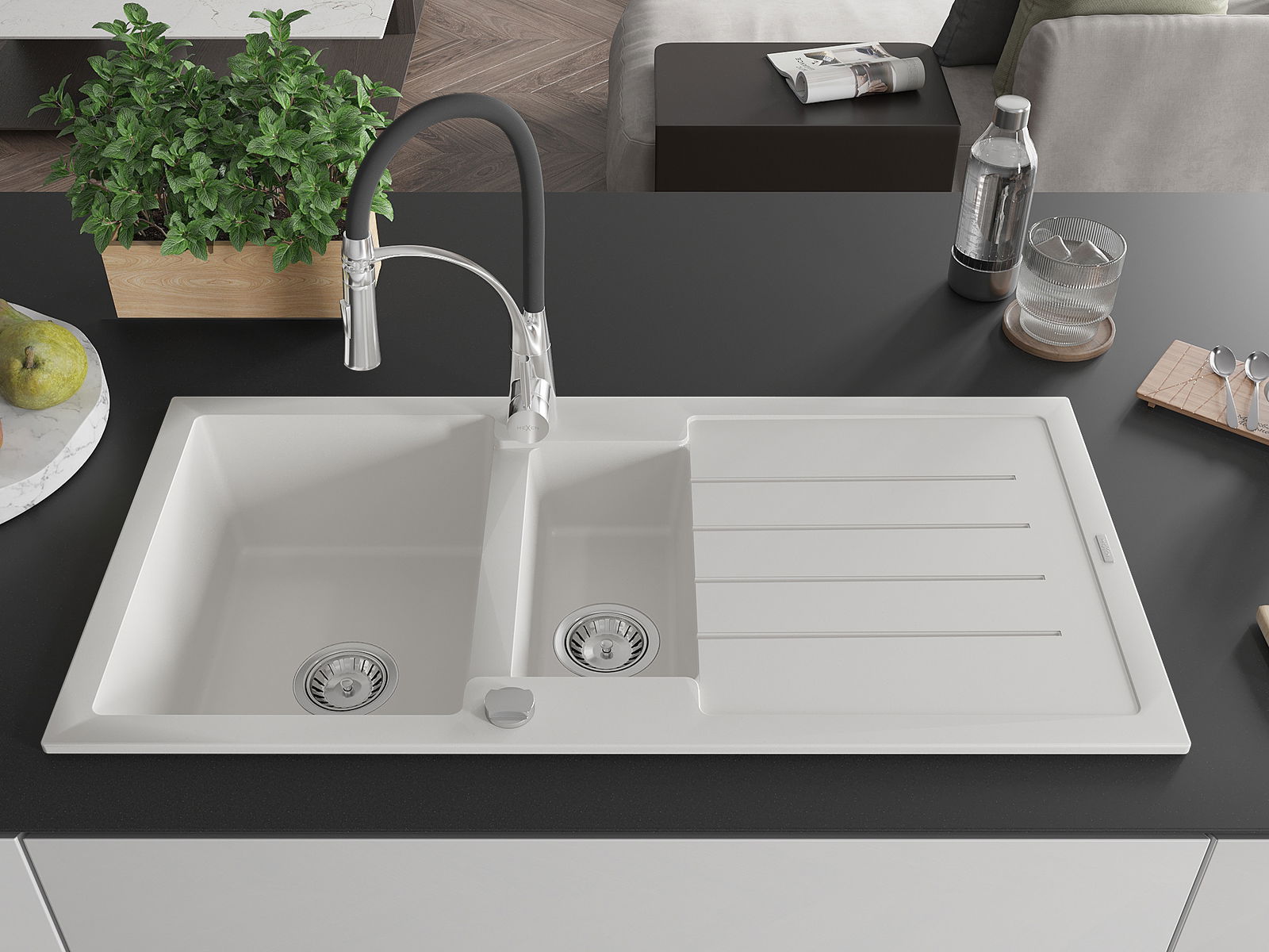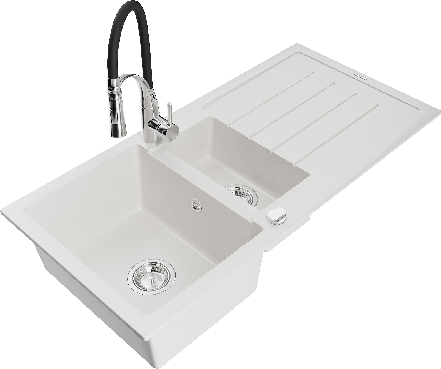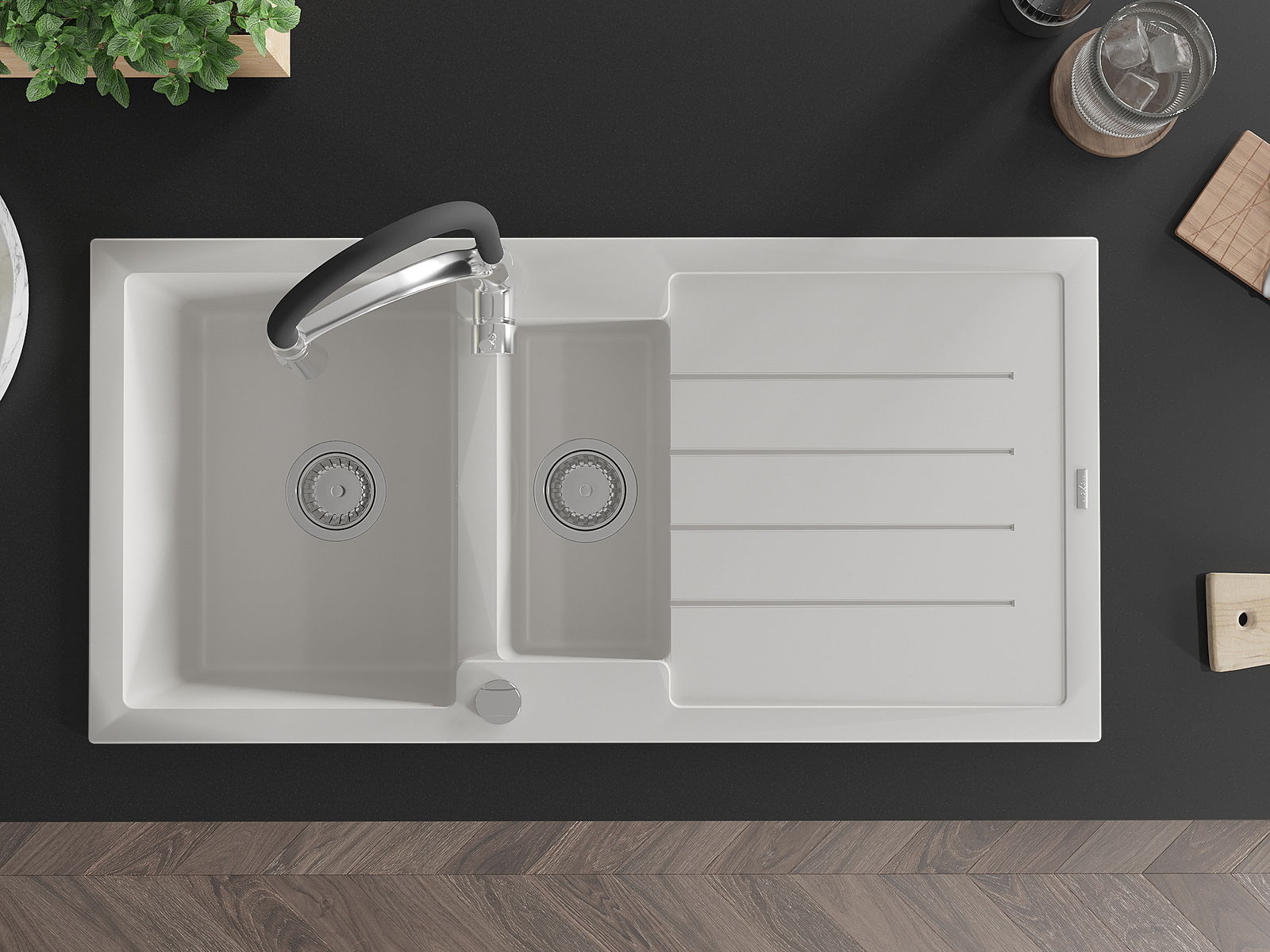 Mexen Andres évier en granit 1,5 bac avec égouttoir et robinet de cuisine Aster, blanc - 6515-20-73450-07