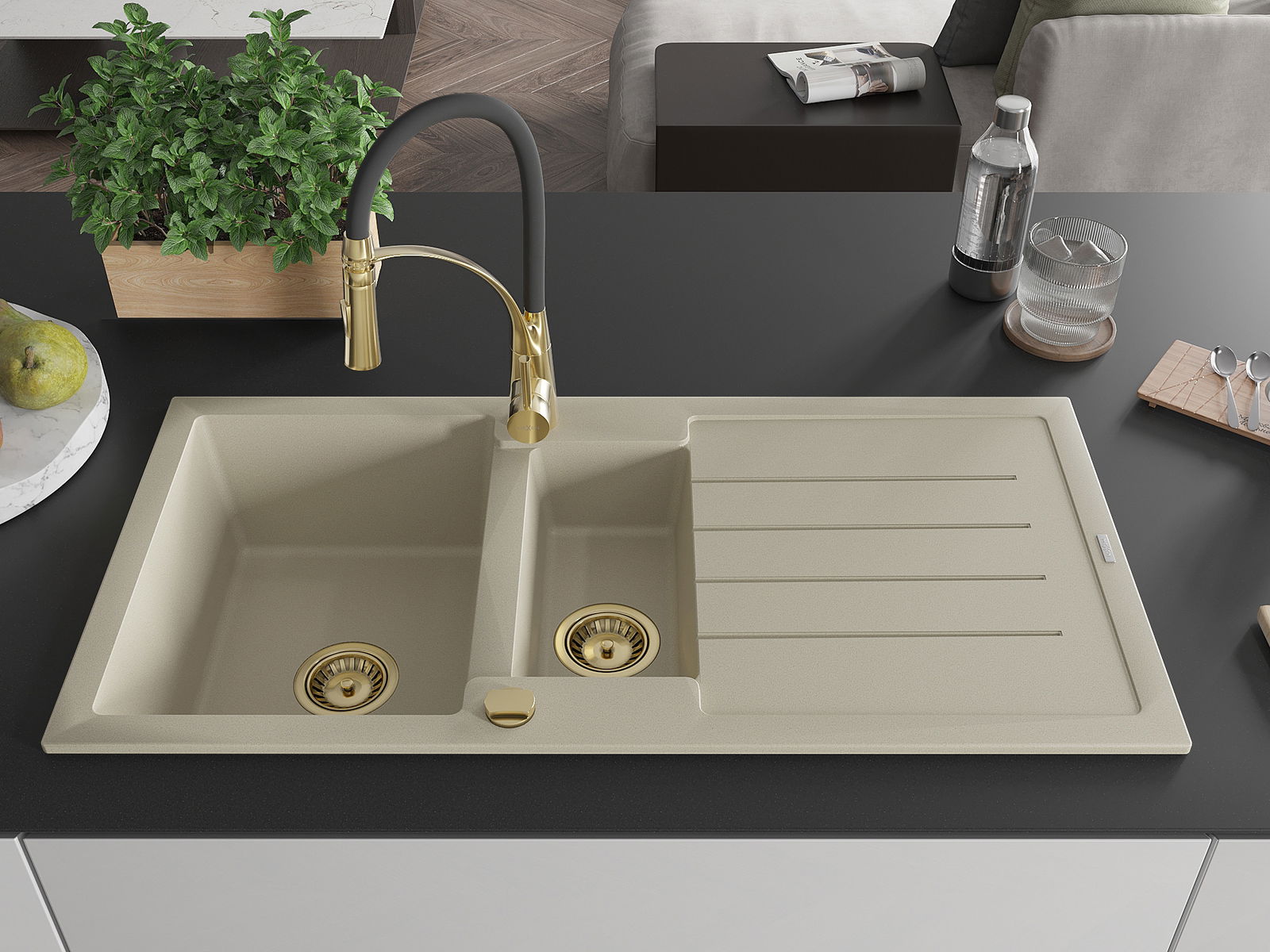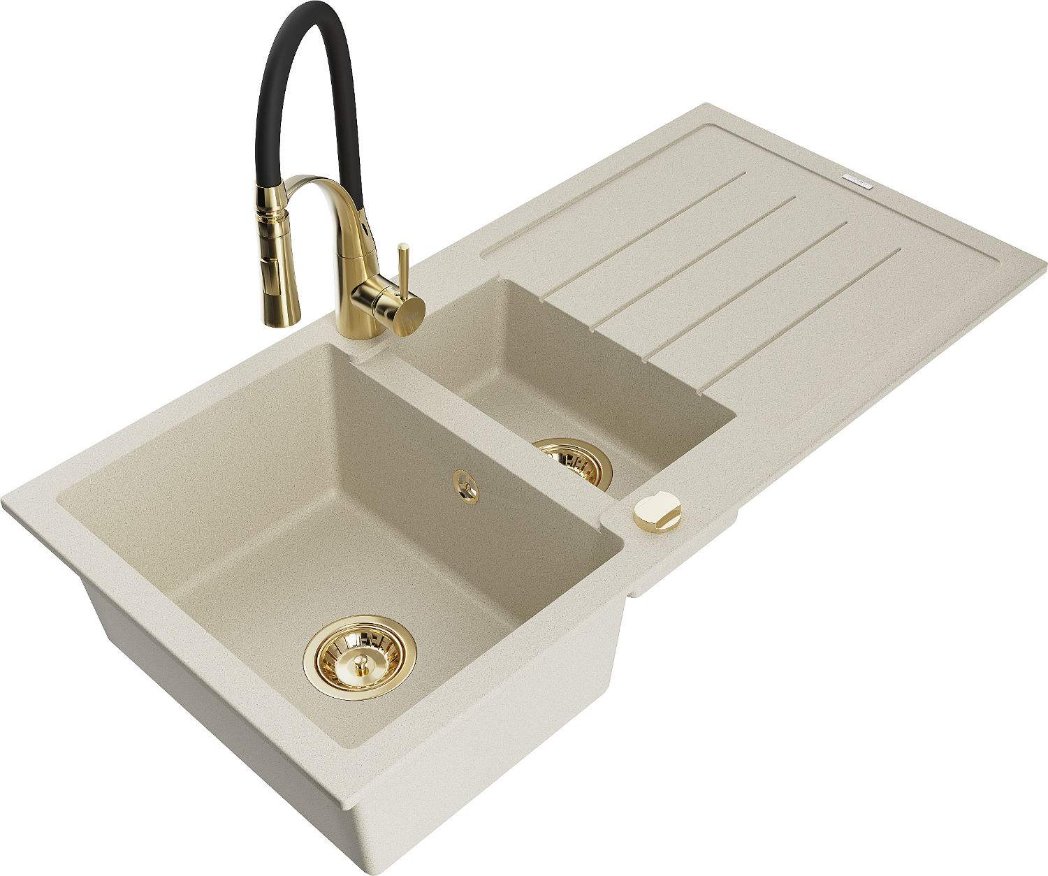 Mexen Andres évier en granit 1,5 bac avec égouttoir et robinet de cuisine Aster, beige - 6515-69-73450-57-G