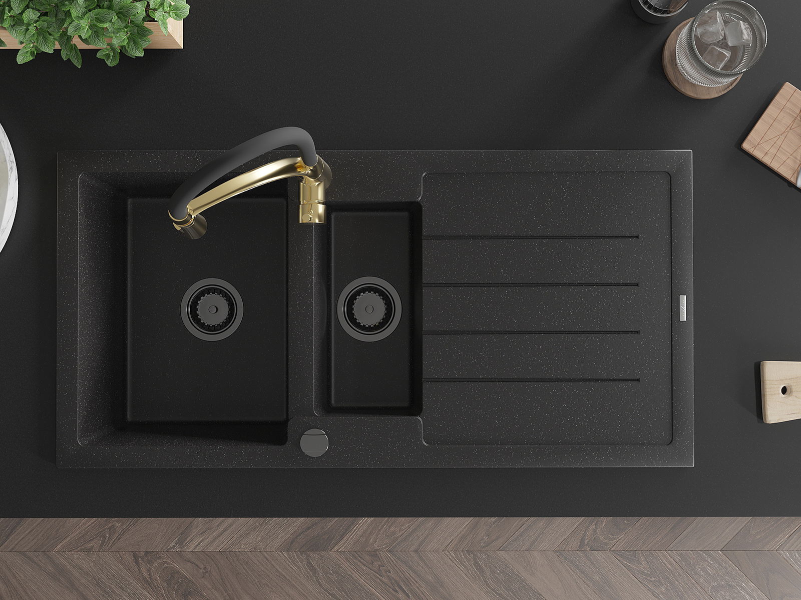 Mexen Andres évier en granit 1,5 bac avec égouttoir et robinet de cuisine Aster, noir/argent - 6515-73-73450-57-B