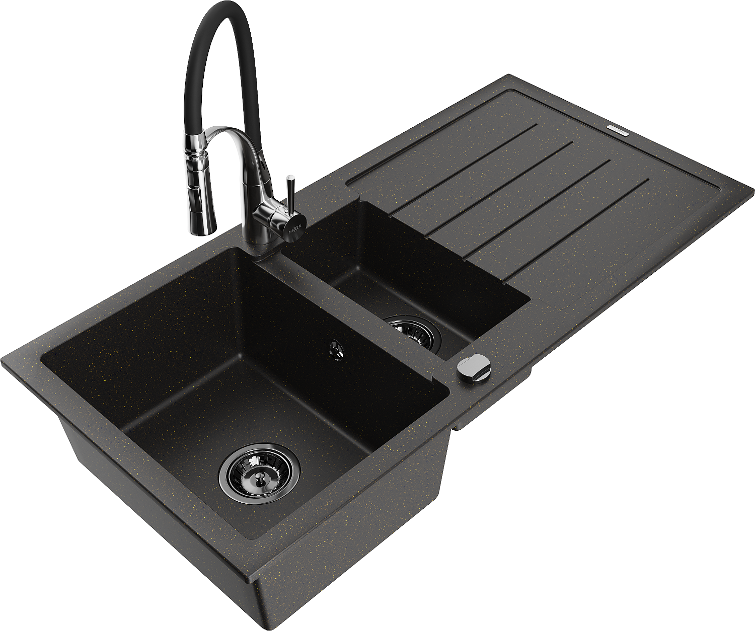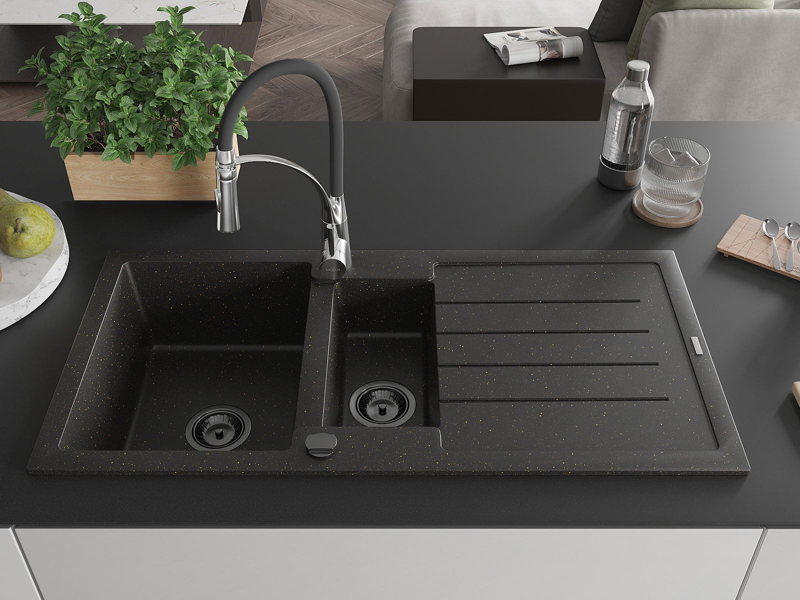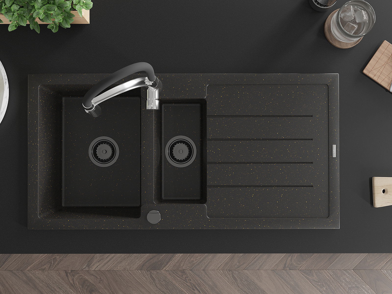 Mexen Andres évier en granit 1,5 bac avec égouttoir et robinet de cuisine Aster, noir/doré métallique - 6515-75-73450-07-B