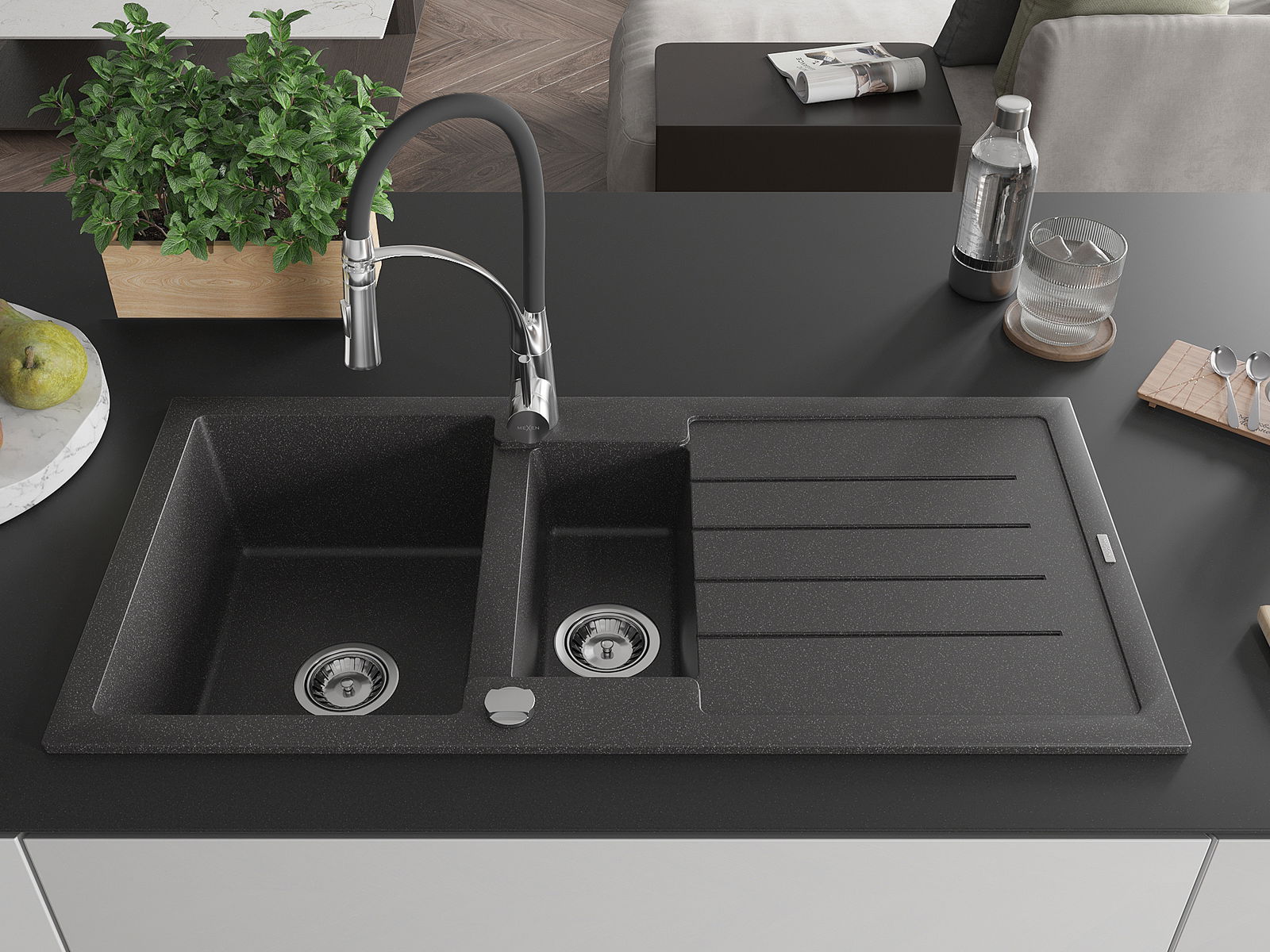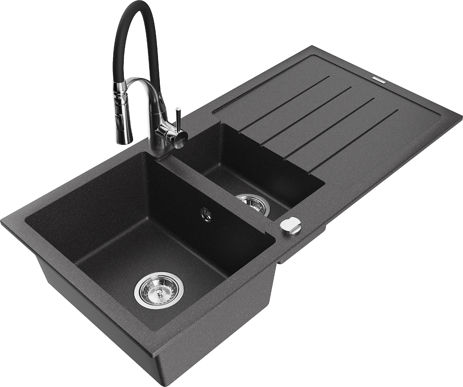 Mexen Andres évier de cuisine en granit à 1,5 bac avec égouttoir et robinet de cuisine Aster, noir moucheté - 6515-76-73450-07
