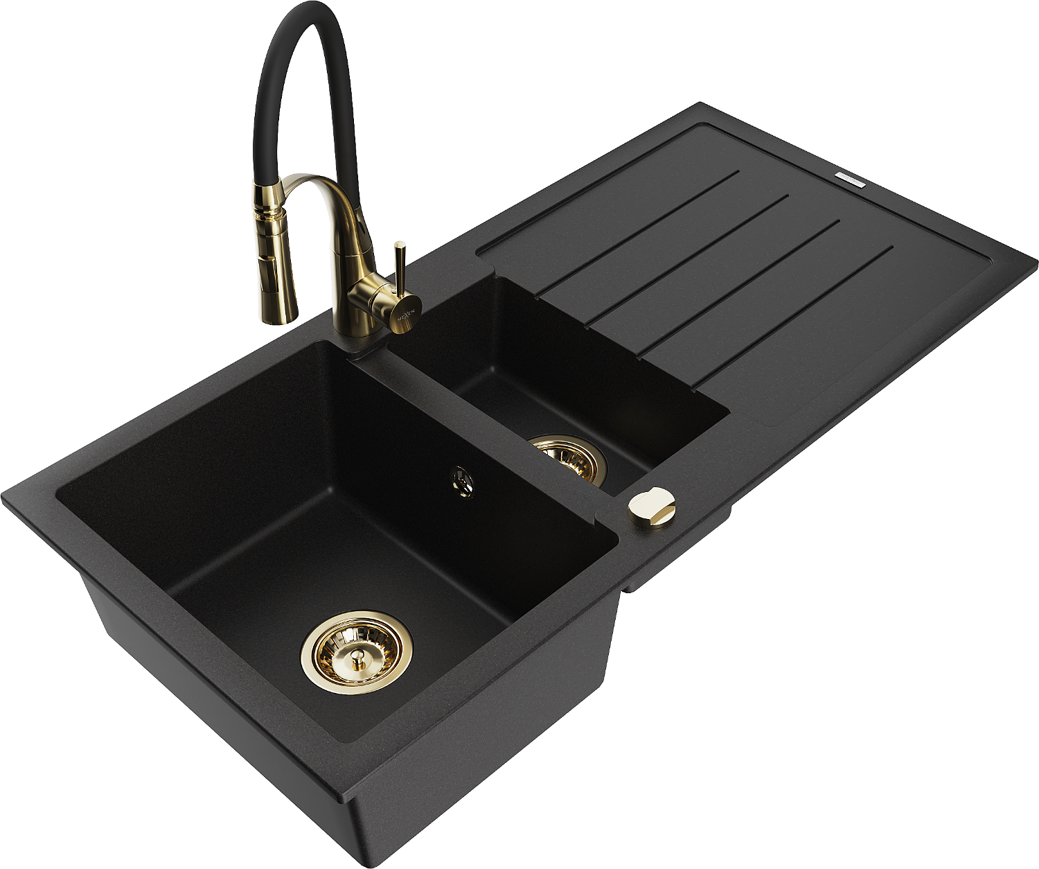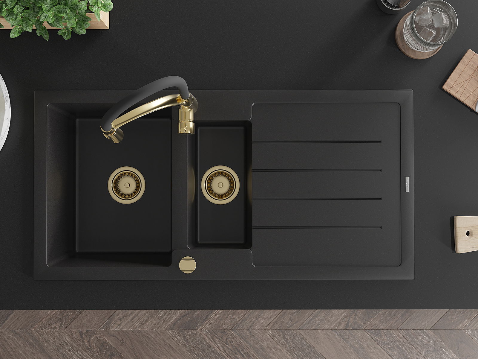 Mexen Andres évier en granit 1,5 bac avec égouttoir et robinet cuisine Aster, noir - 6515-77-73450-57-G