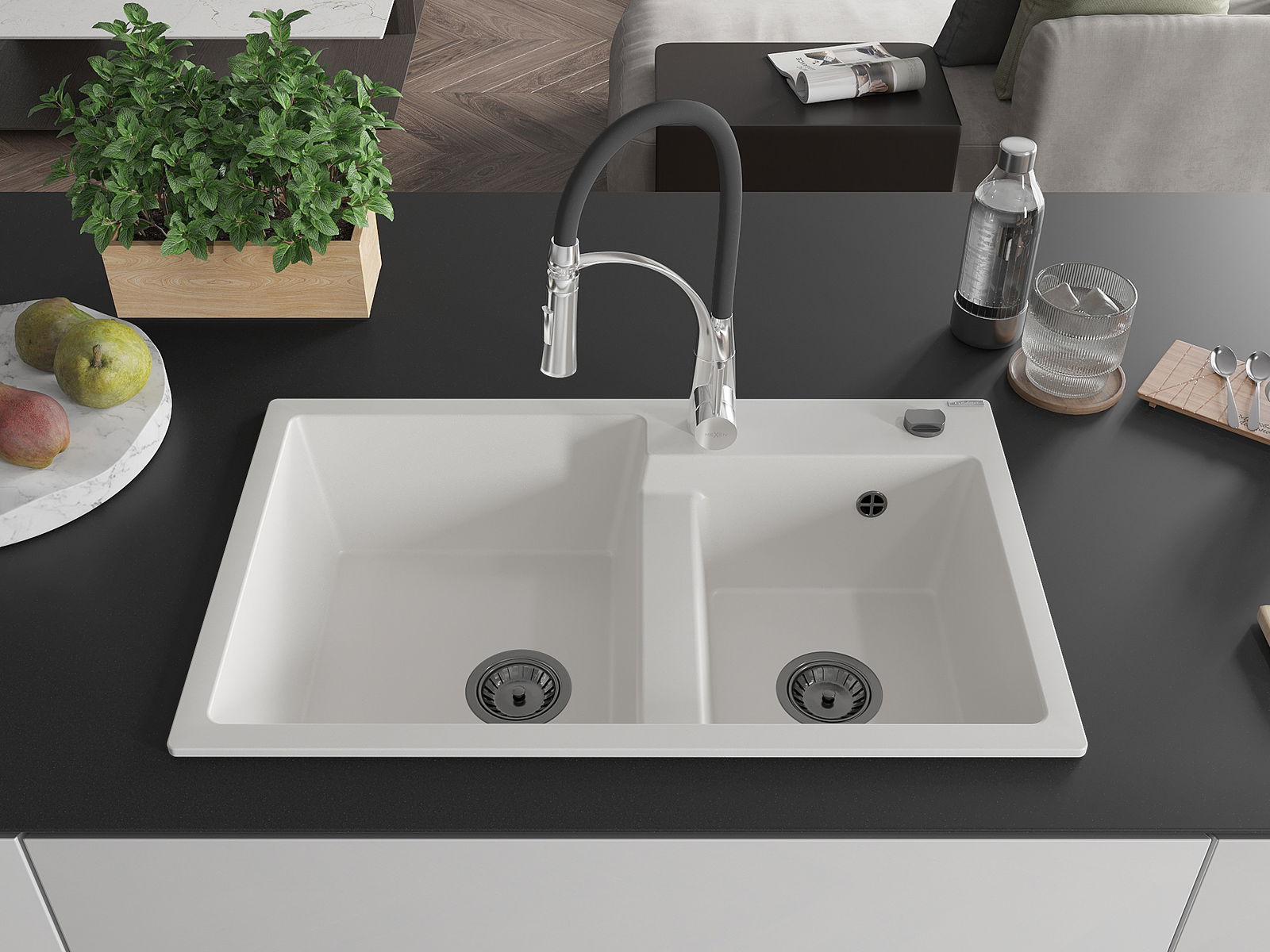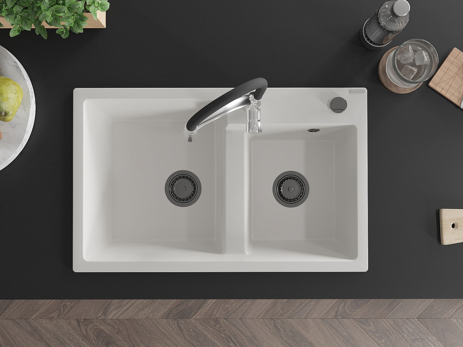 Mexen Tomas évier en granit 2 bacs avec mitigeur de cuisine Aster, blanc - 6516-20-73450-07-B
