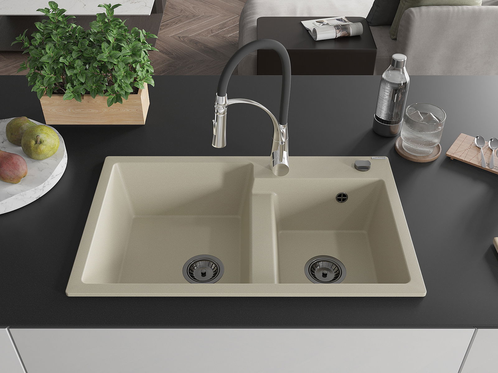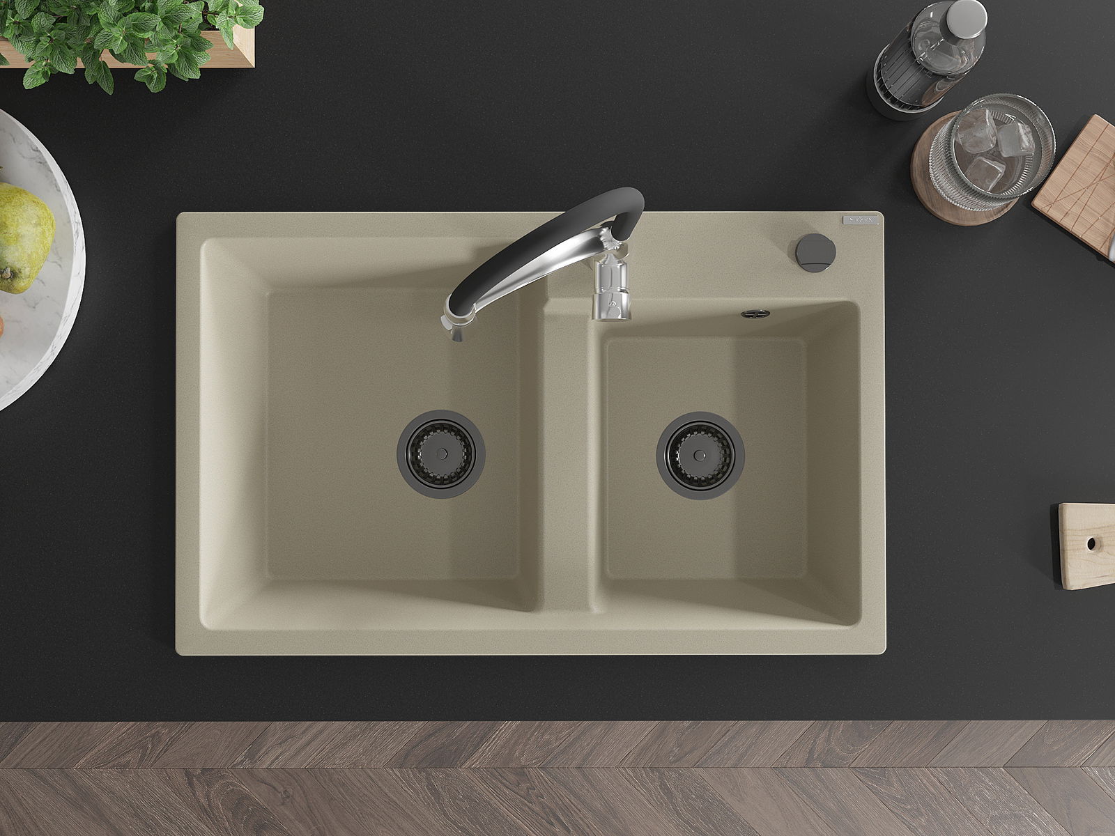 Mexen Tomas évier en granit à 2 bacs avec robinet de cuisine Aster, beige - 6516-69-73450-07-B
