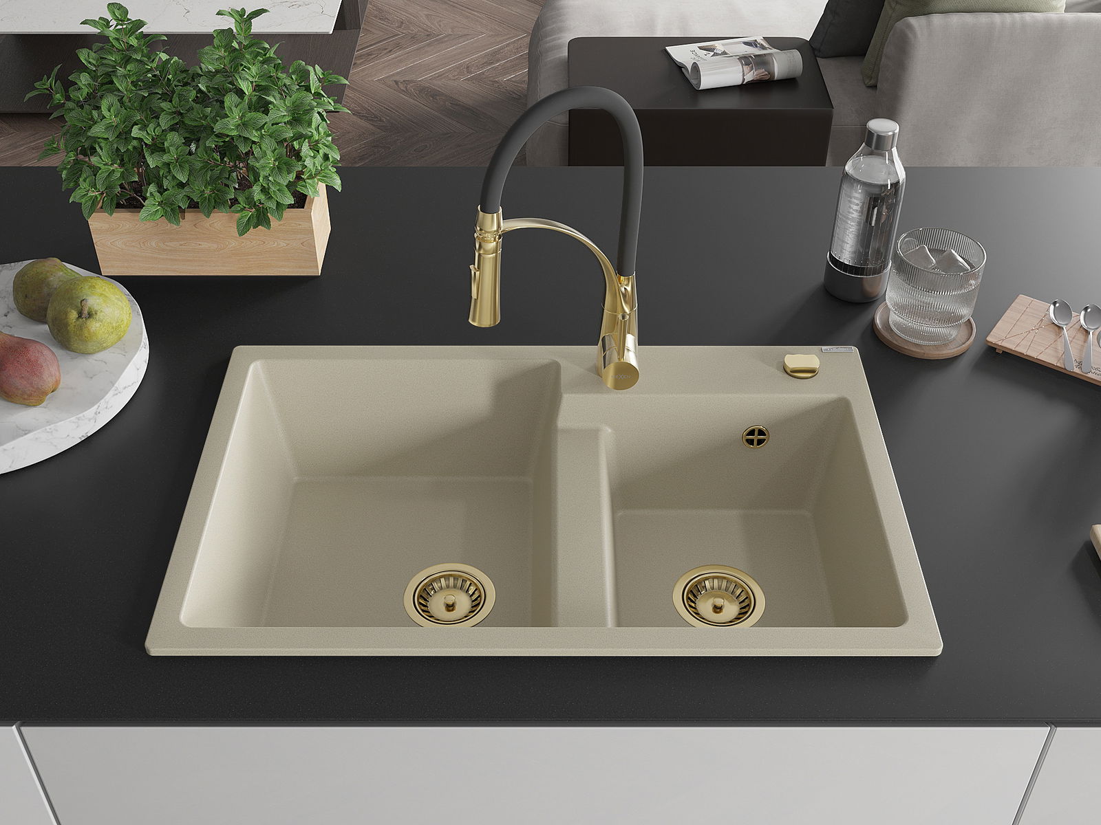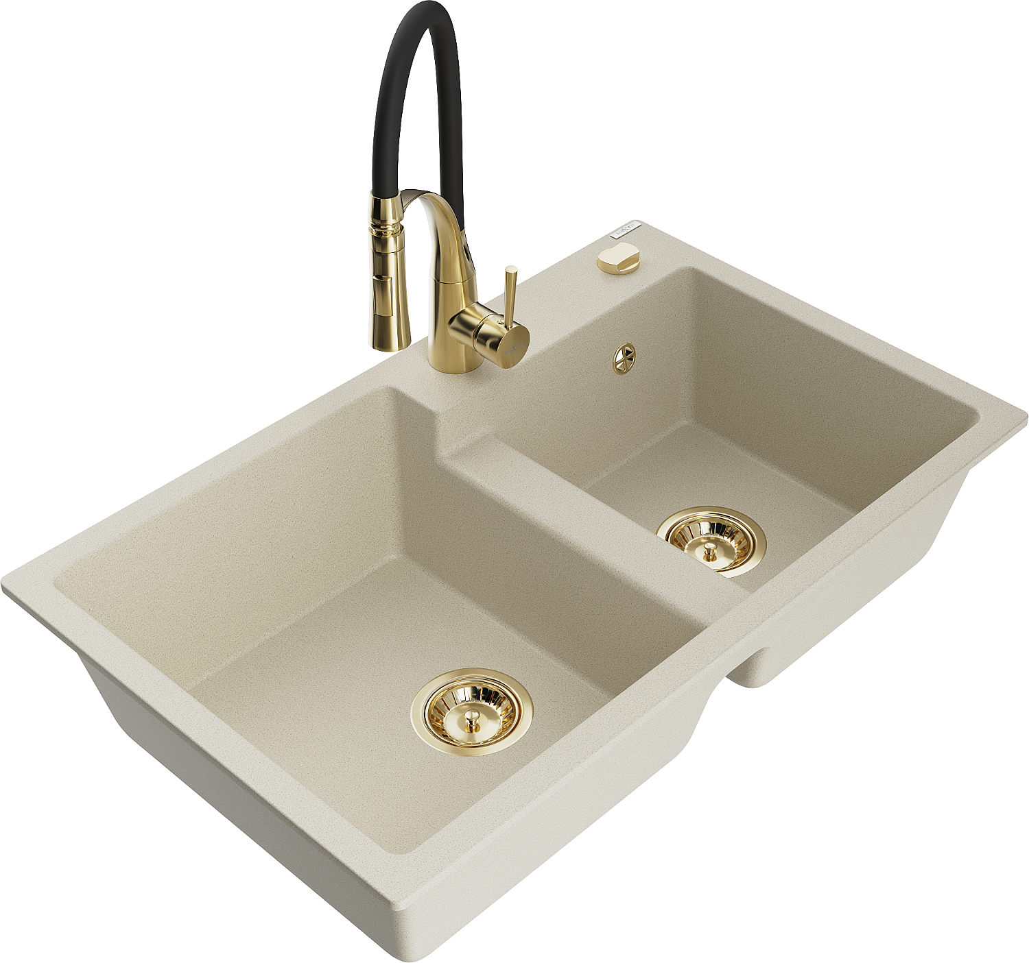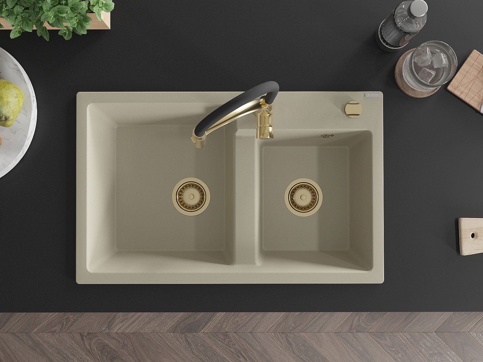 Mexen Tomas évier en granit à 2 bacs avec mitigeur de cuisine Aster, beige - 6516-69-73450-57-G