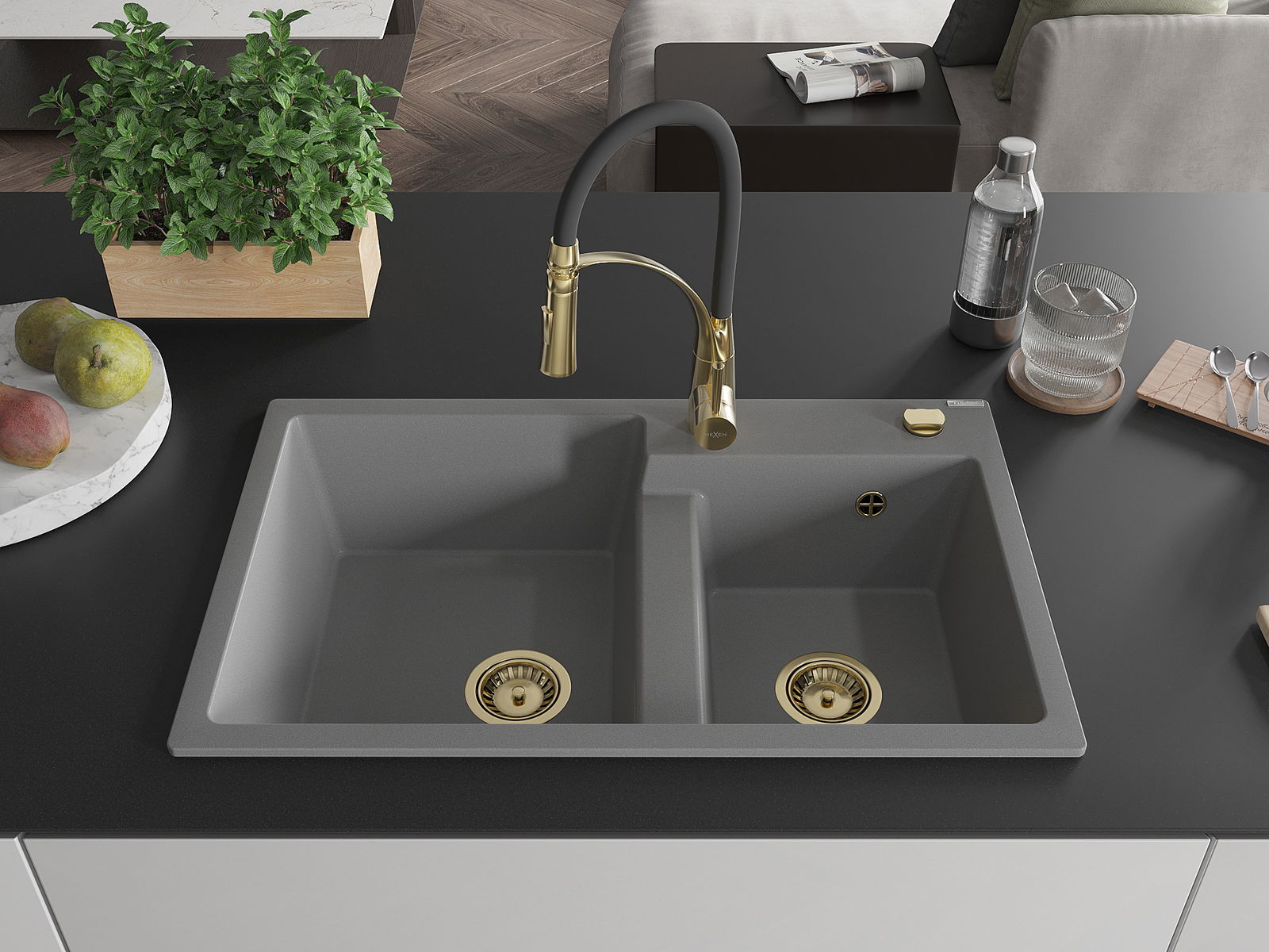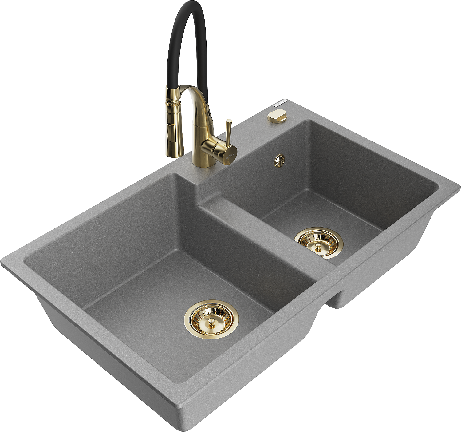 Mexen Tomas évier de cuisine en granit à 2 bacs avec mitigeur Aster, gris - 6516-71-73450-57-G