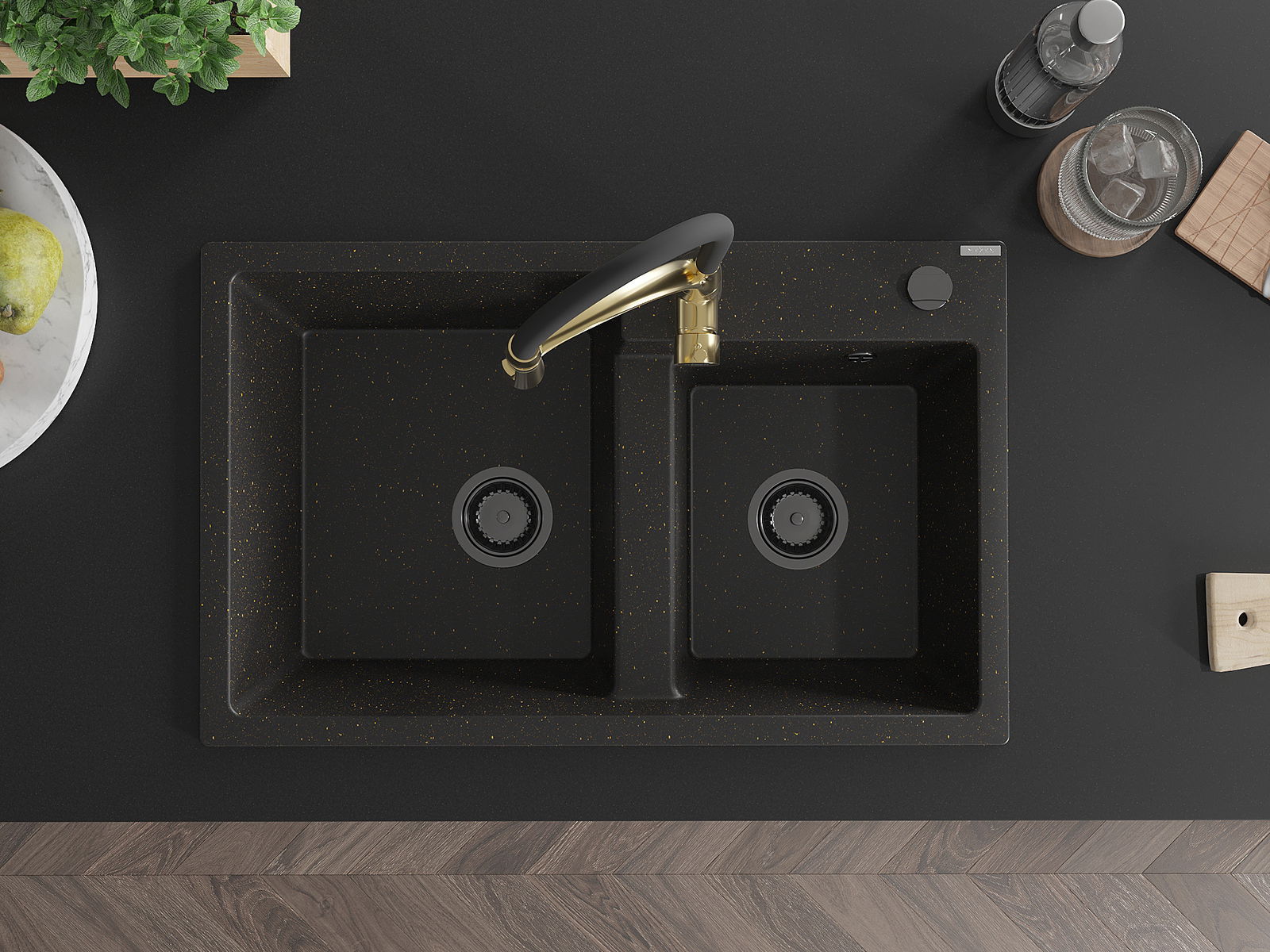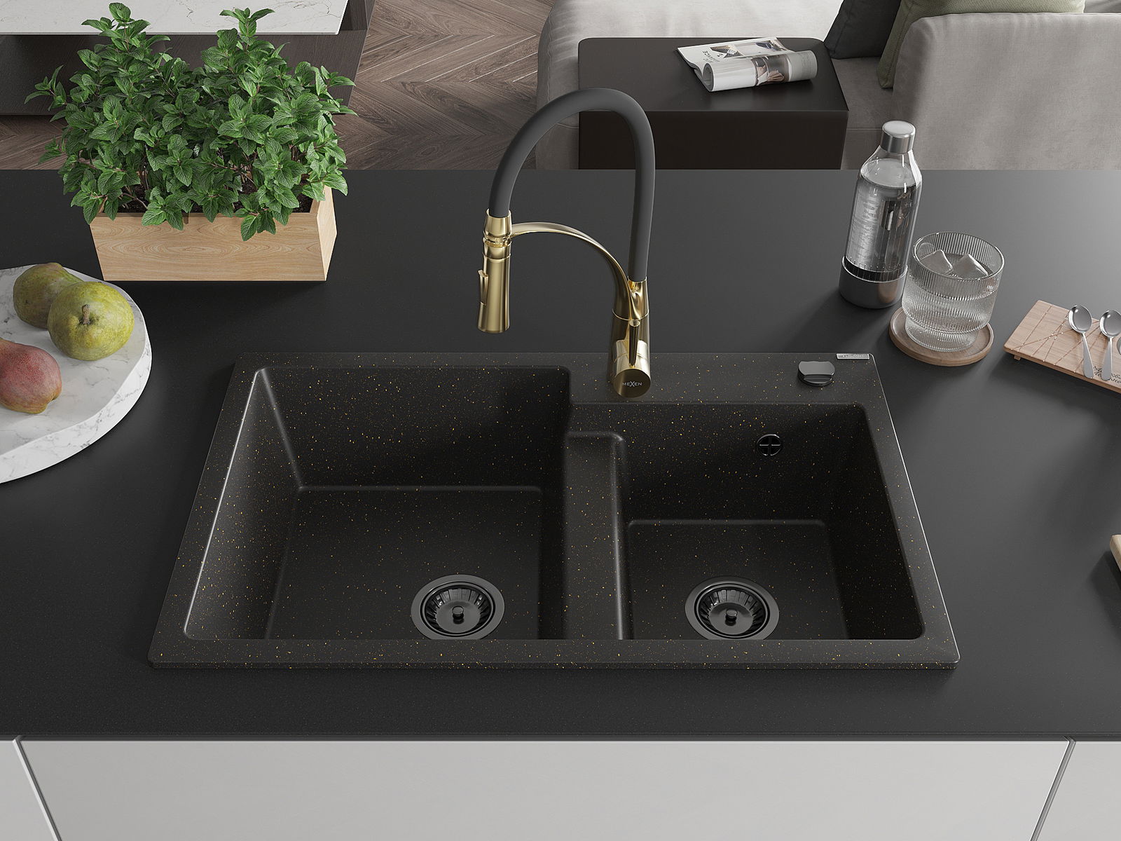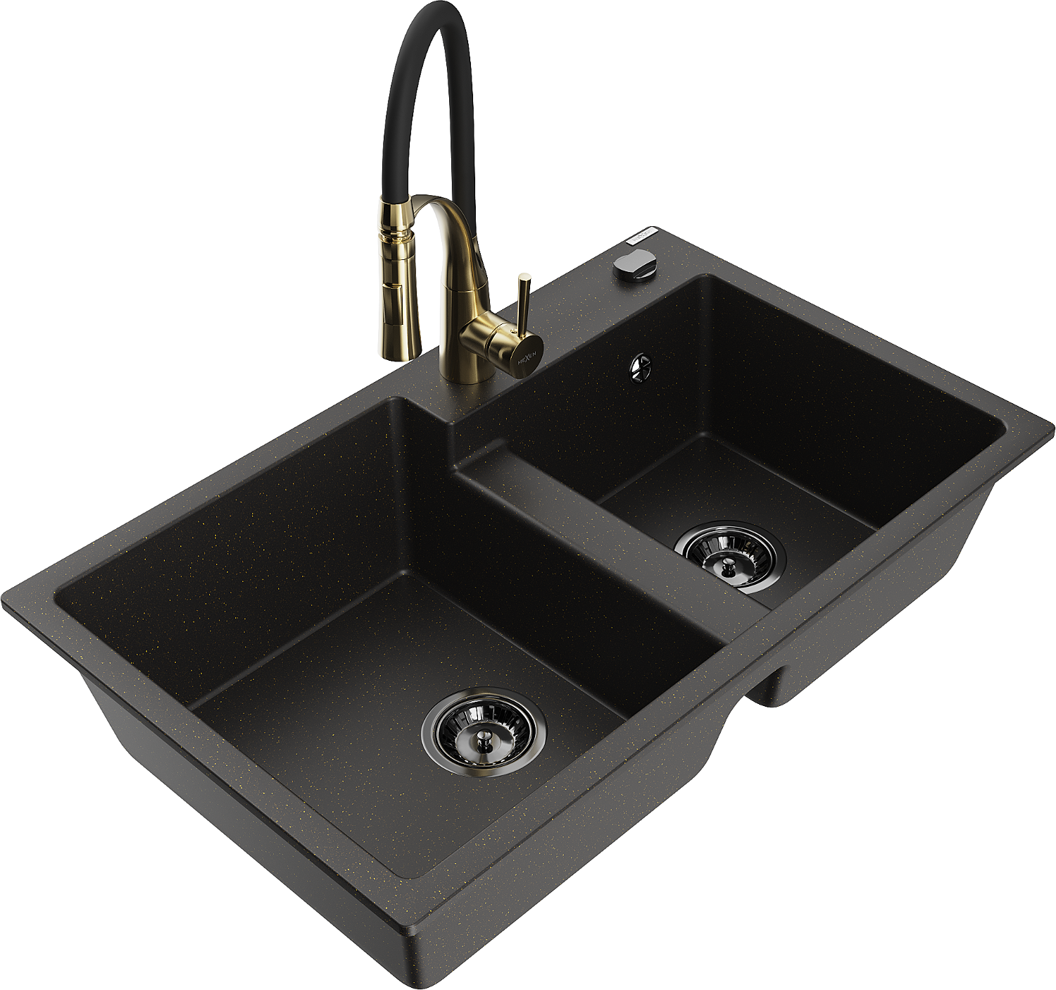 Mexen Tomas évier en granit 2 bacs avec robinet de cuisine Aster, noir/doré métallisé - 6516-75-73450-57-B