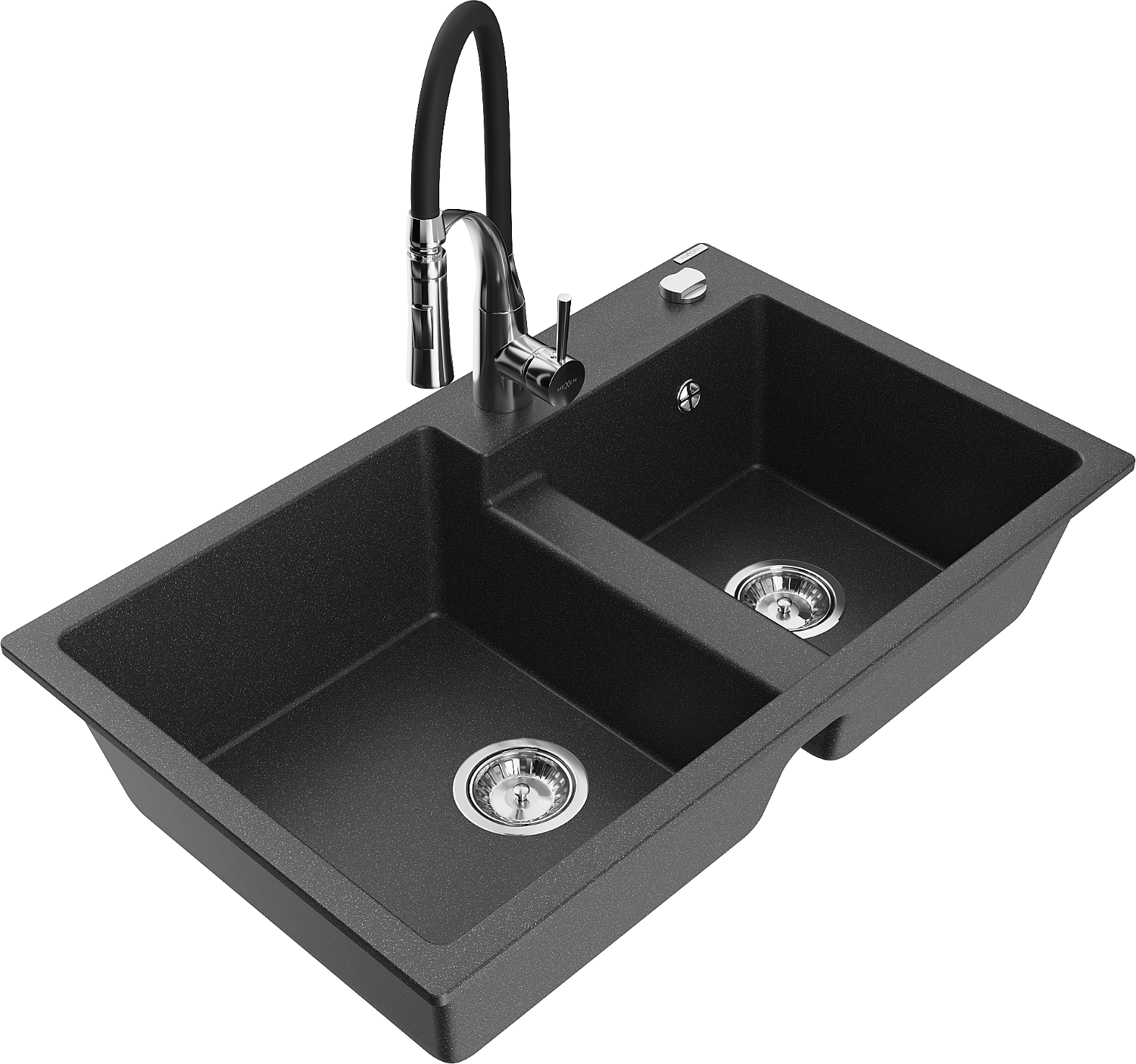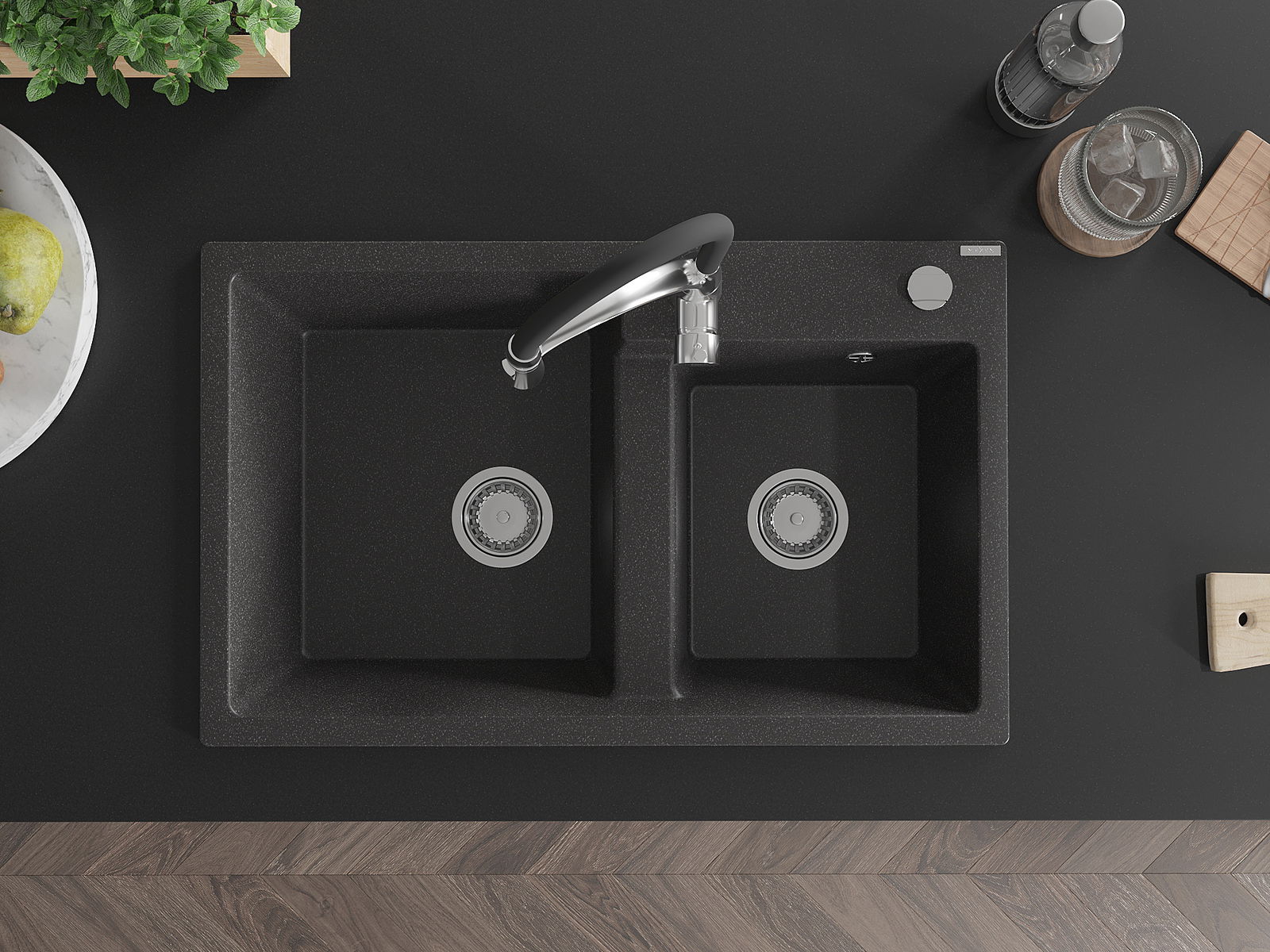 Mexen Tomas évier granitique 2 cuves avec robinet de cuisine Aster, noir moucheté - 6516-76-73450-07
