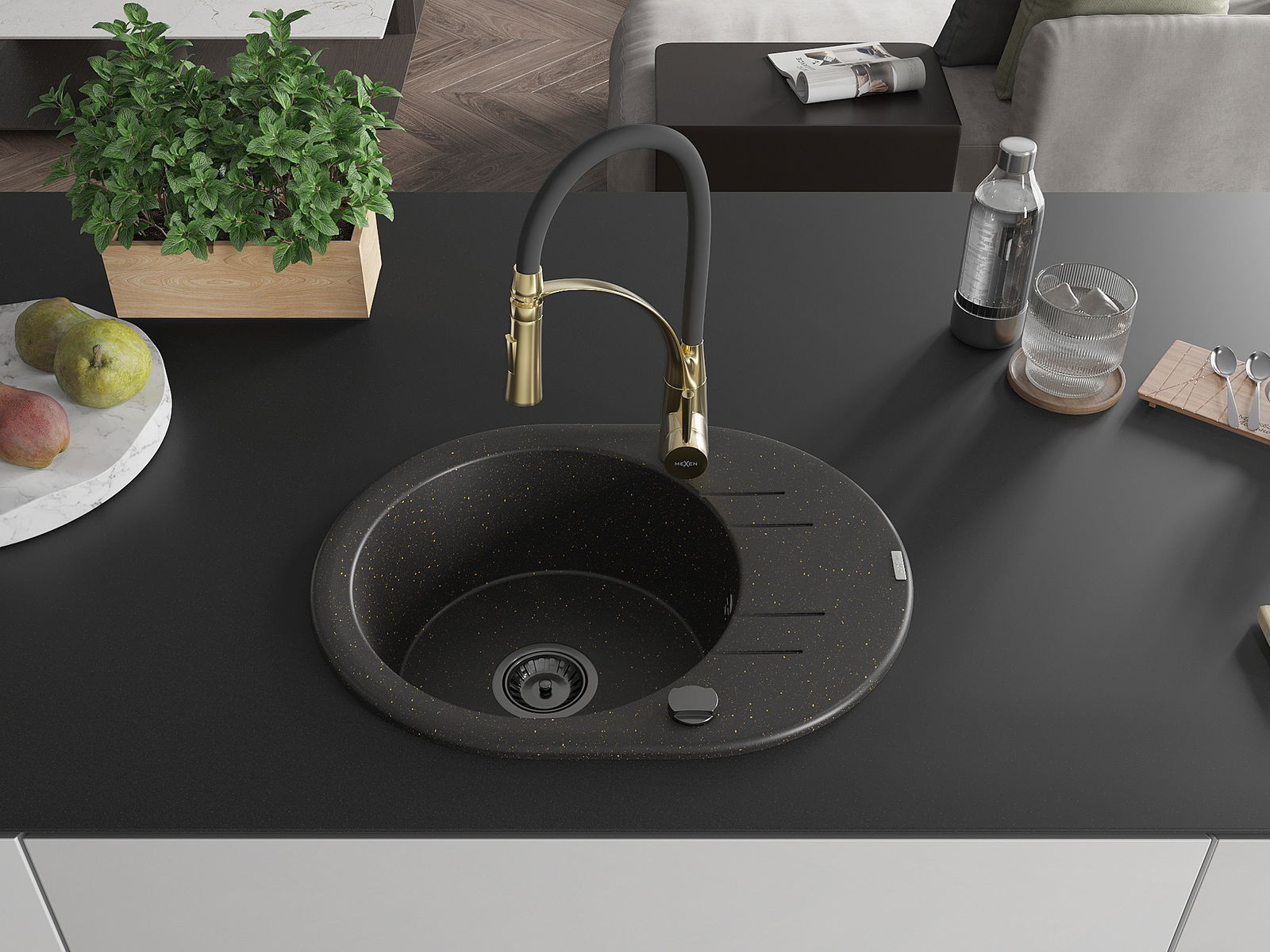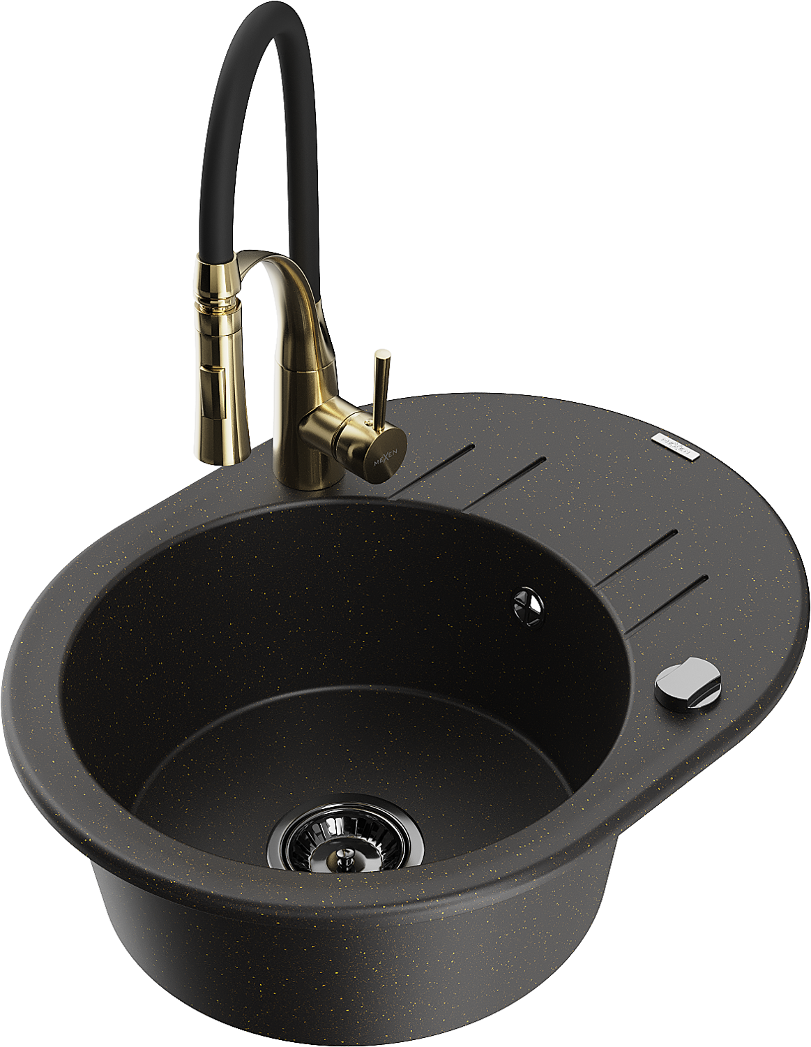 Mexen Kevin évier en granit à 1 bac avec égouttoir et robinet de cuisine Aster, noir/doré métallisé - 6517-75-73450-57-B
