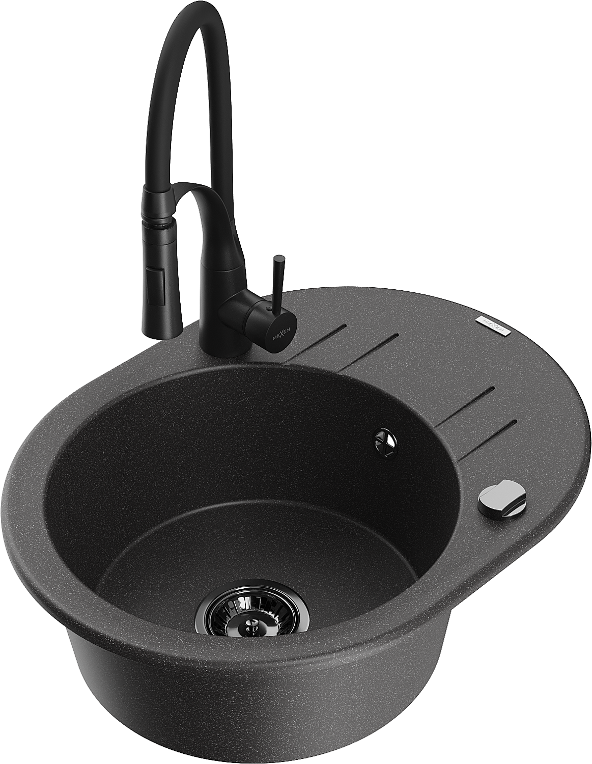 Mexen Kevin évier de cuisine en granit 1 bac avec égouttoir et robinet de cuisine Aster, noir moucheté - 6517-76-73450-70-B