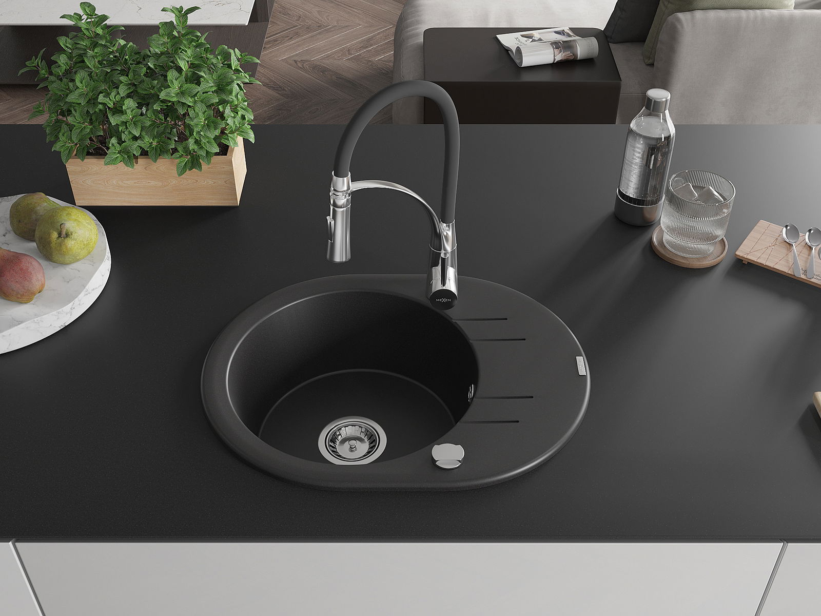 Mexen Kevin évier en granit à 1 bac avec égouttoir et robinet de cuisine Aster, noir - 6517-77-73450-07