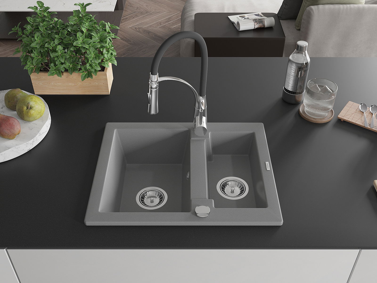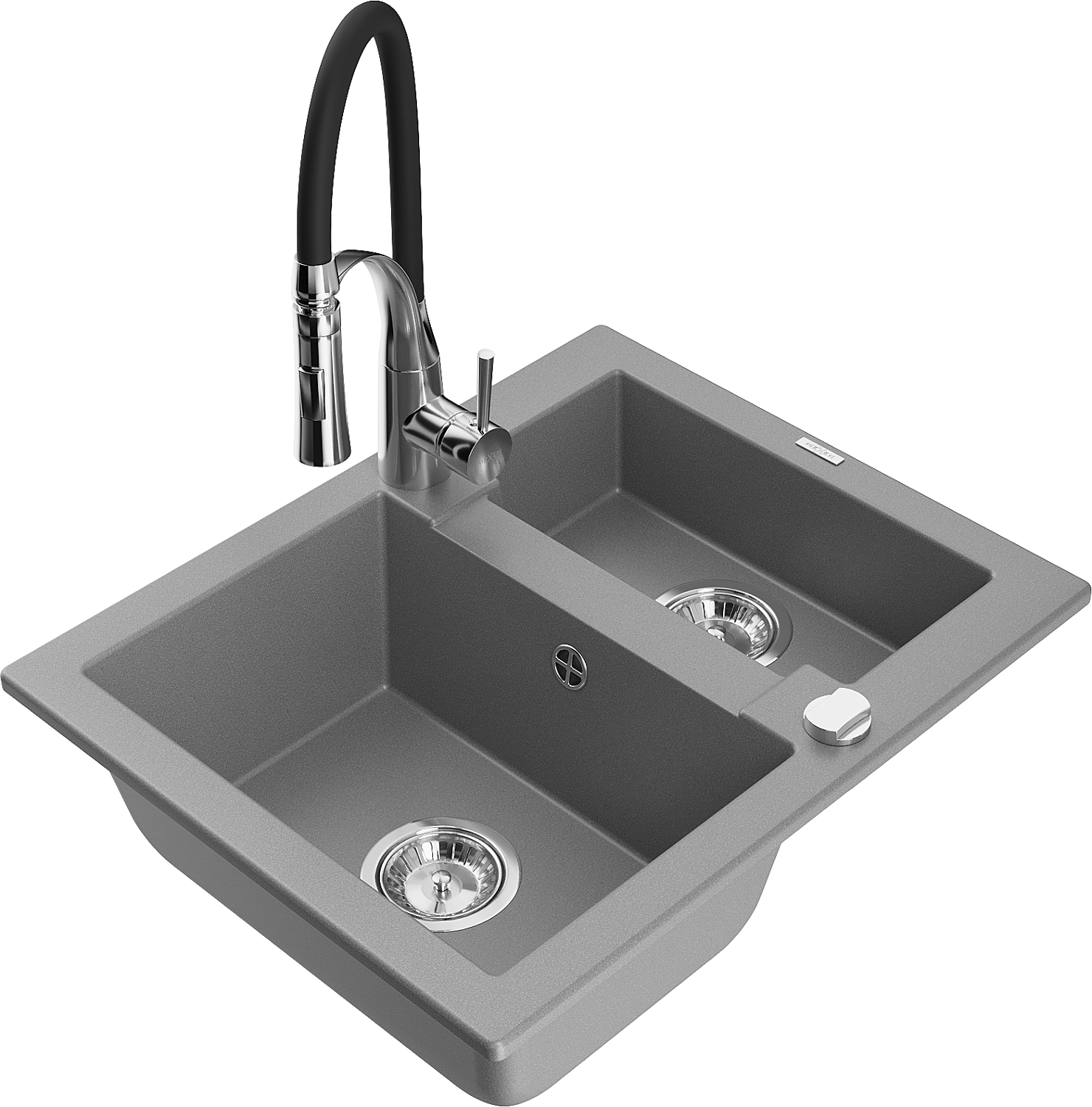 Mexen Carlos évier en granit 1,5 bac avec robinet de cuisine Aster, gris - 6518-71-73450-07