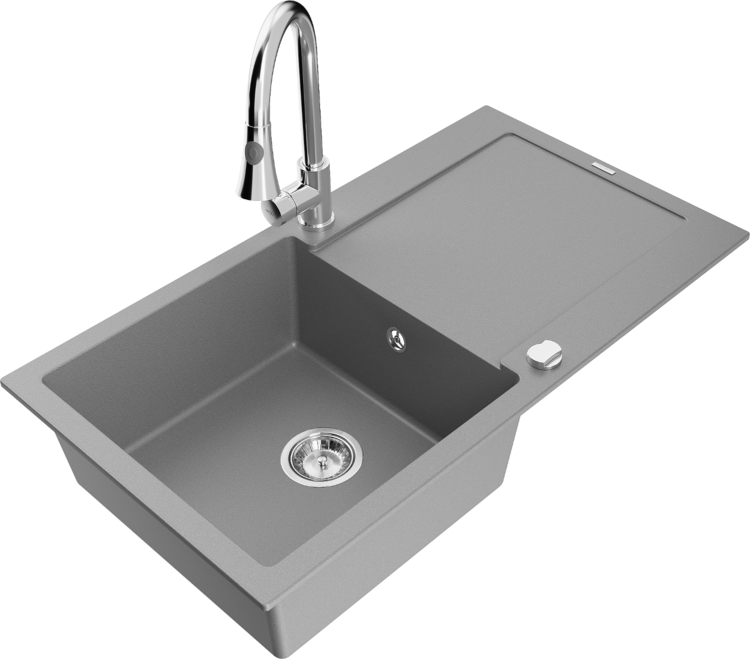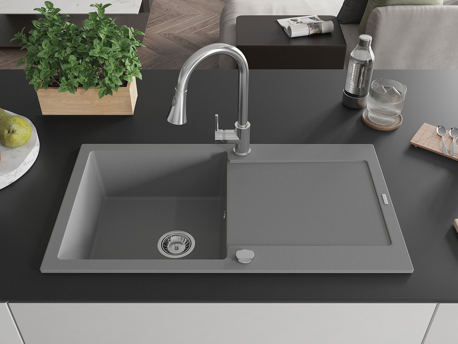 Mexen Leo évier en granit 1 bac avec égouttoir et mitigeur de cuisine Elia, gris - 6501-71-670101-00