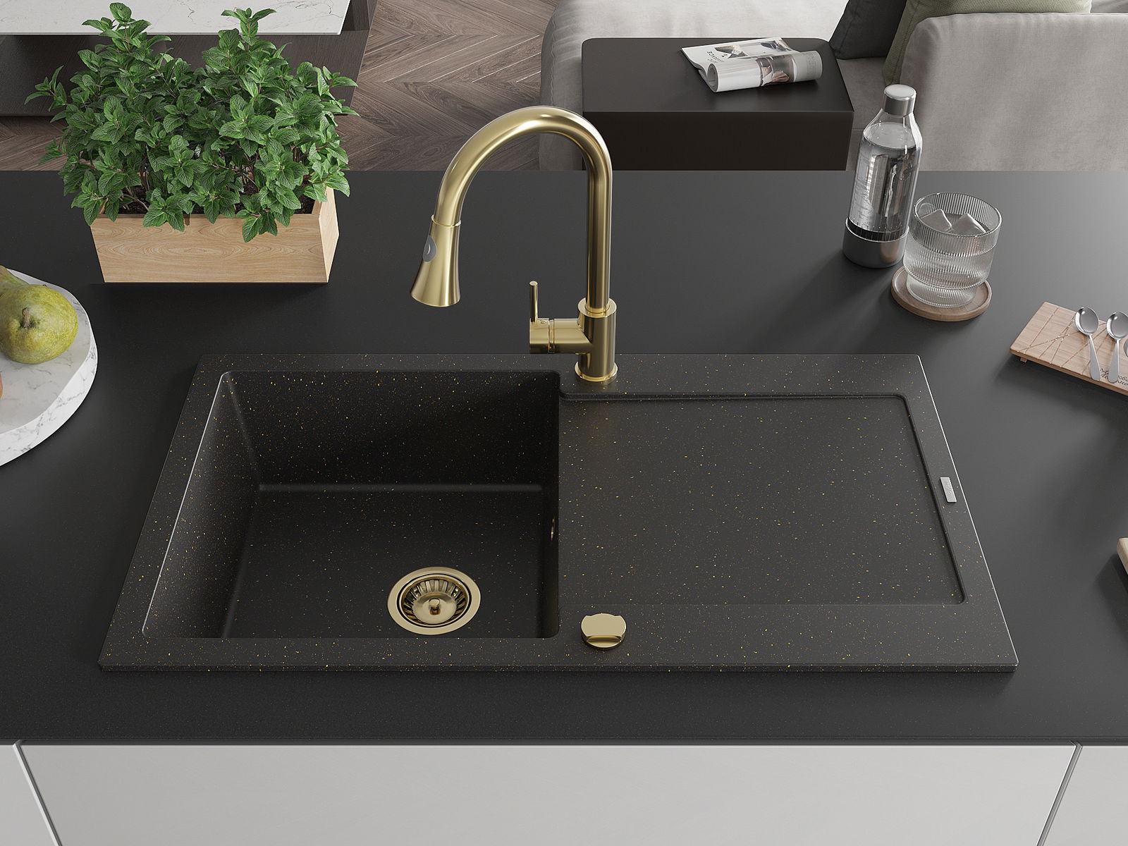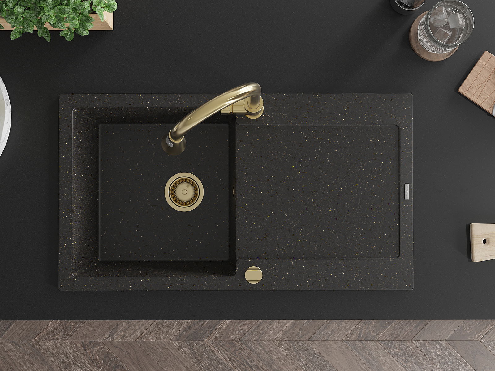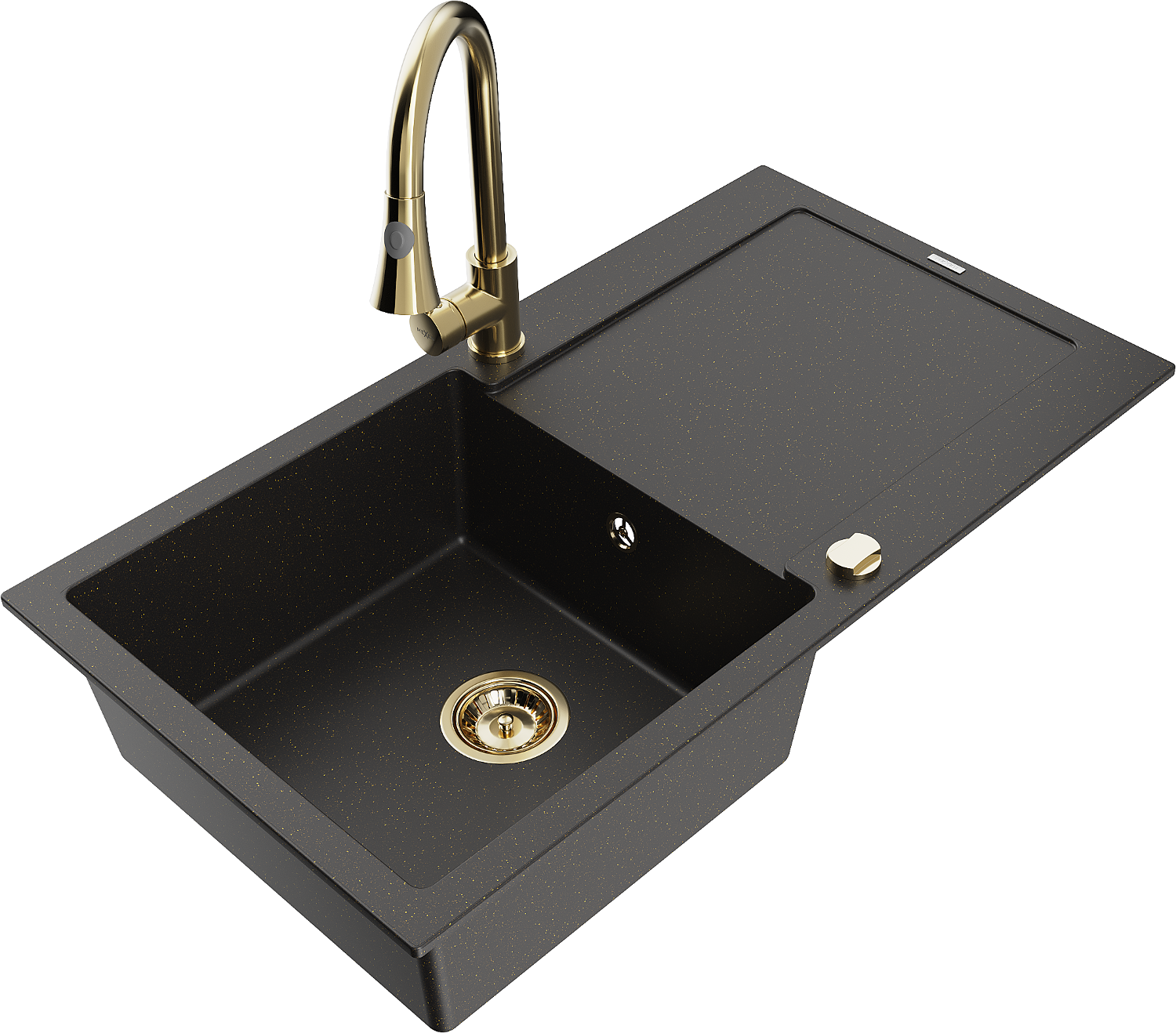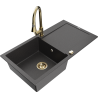 Mexen Leo évier en granit 1 bac avec égouttoir et robinet de cuisine Elia, noir/doré métallisé - 6501-75-670101-50