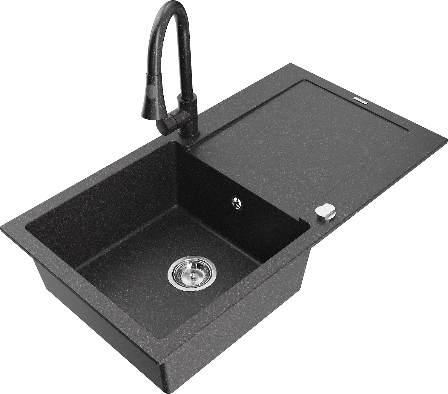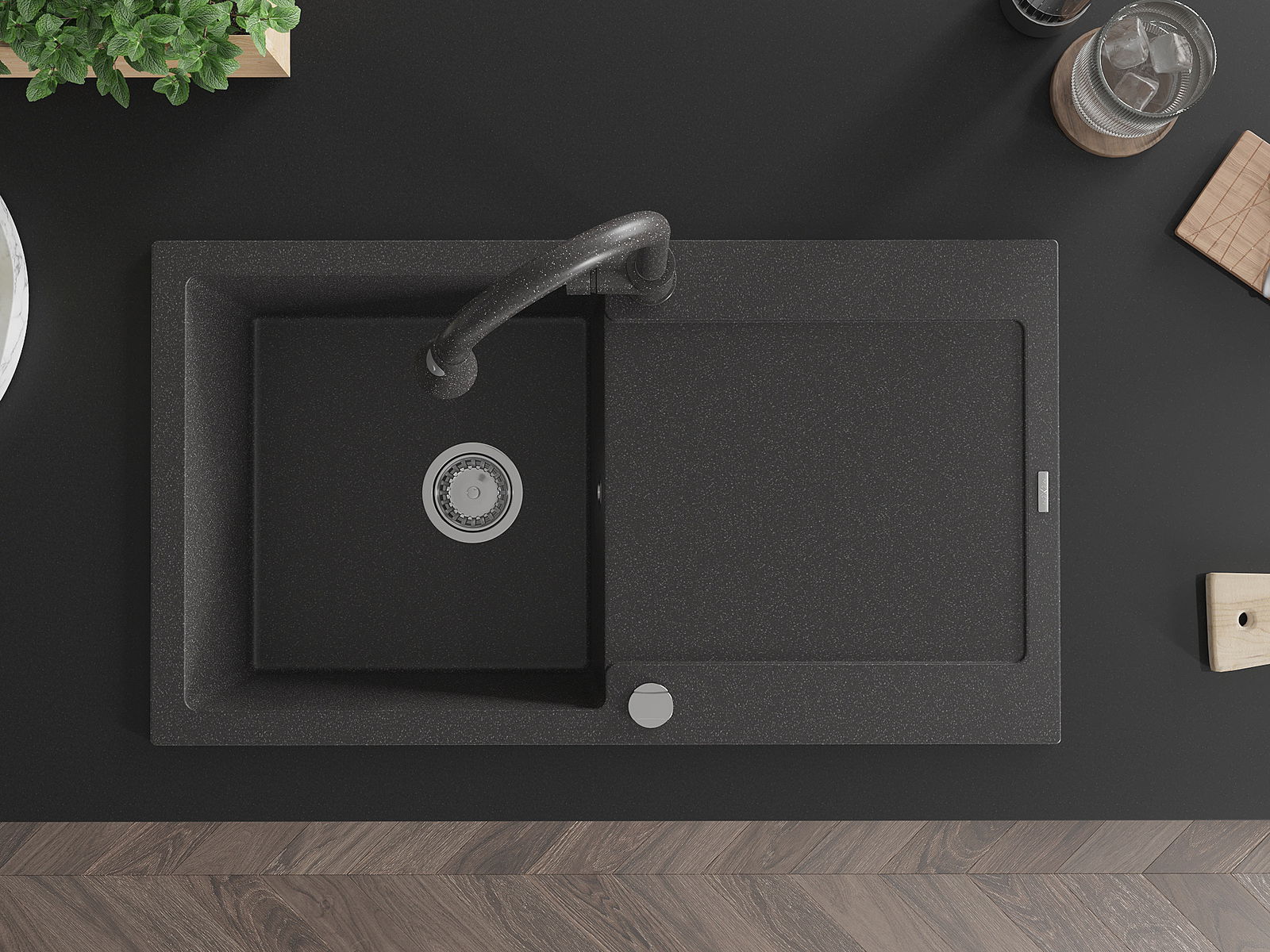 Mexen Leo évier en granit à 1 bac avec égouttoir et robinet de cuisine Elia, noir moucheté - 6501-76-670101-76