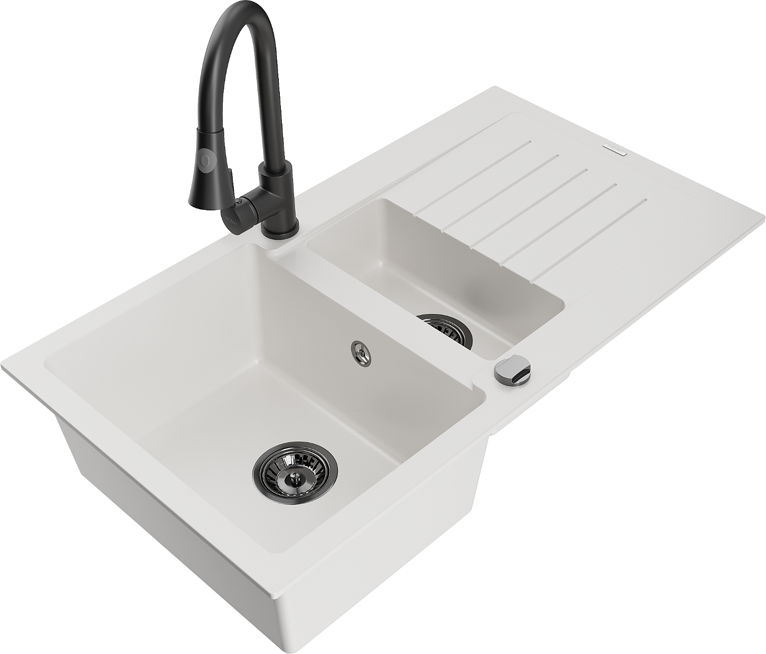 Mexen Matias évier en granit 1,5 bac avec égouttoir et robinet de cuisine Elia, blanc - 6502-20-670101-70