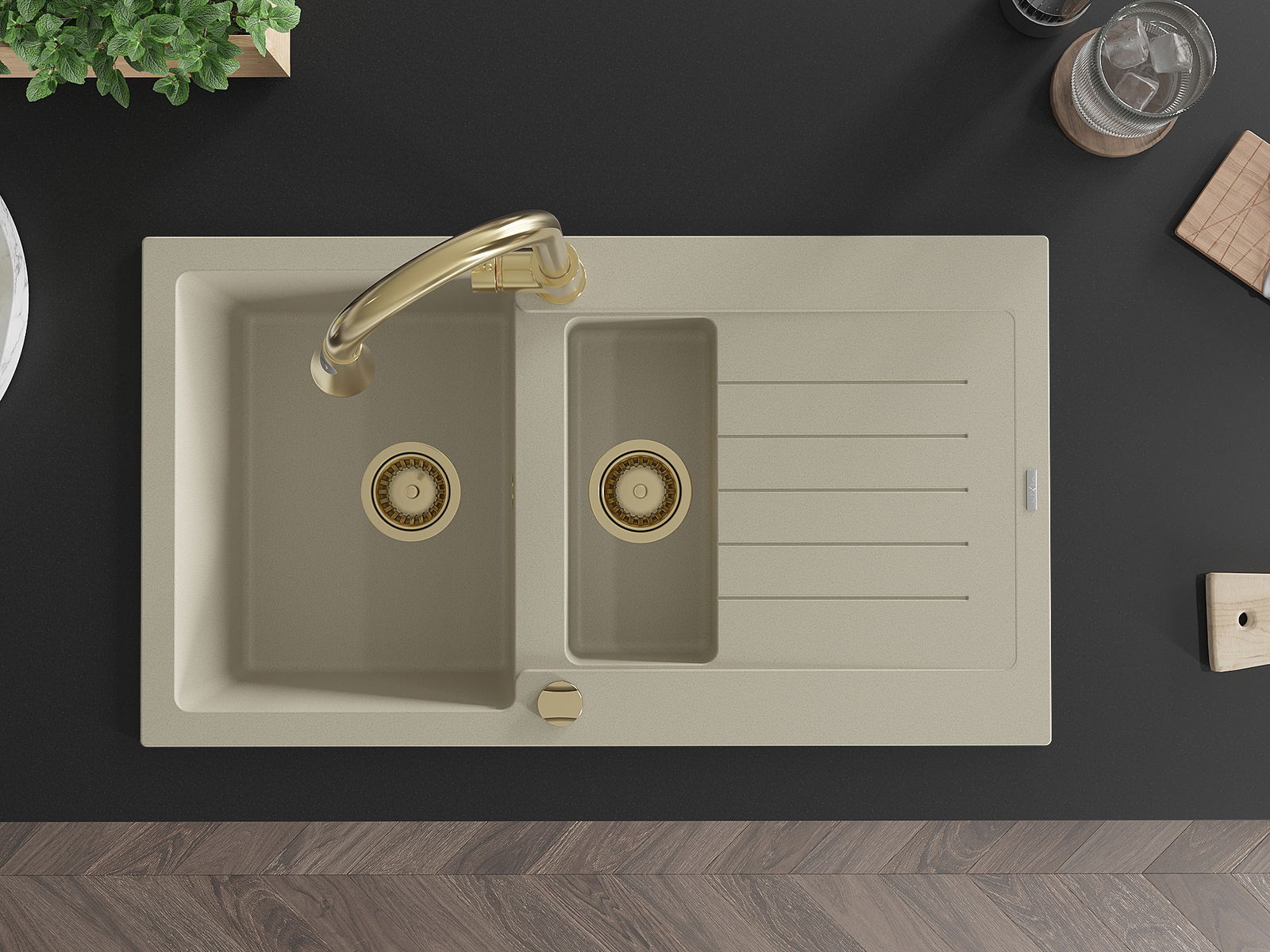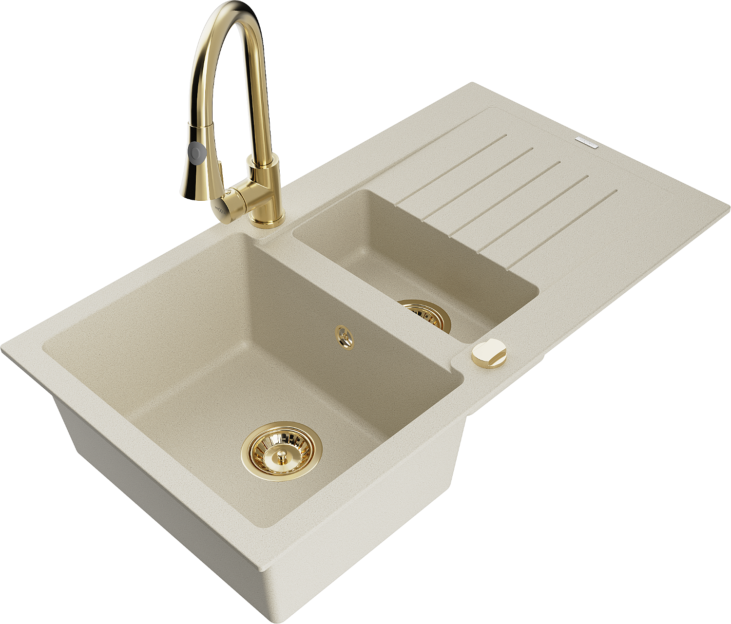 Mexen Matias évier en granit 1,5 bac avec égouttoir et robinet de cuisine Elia, beige - 6502-69-670101-50