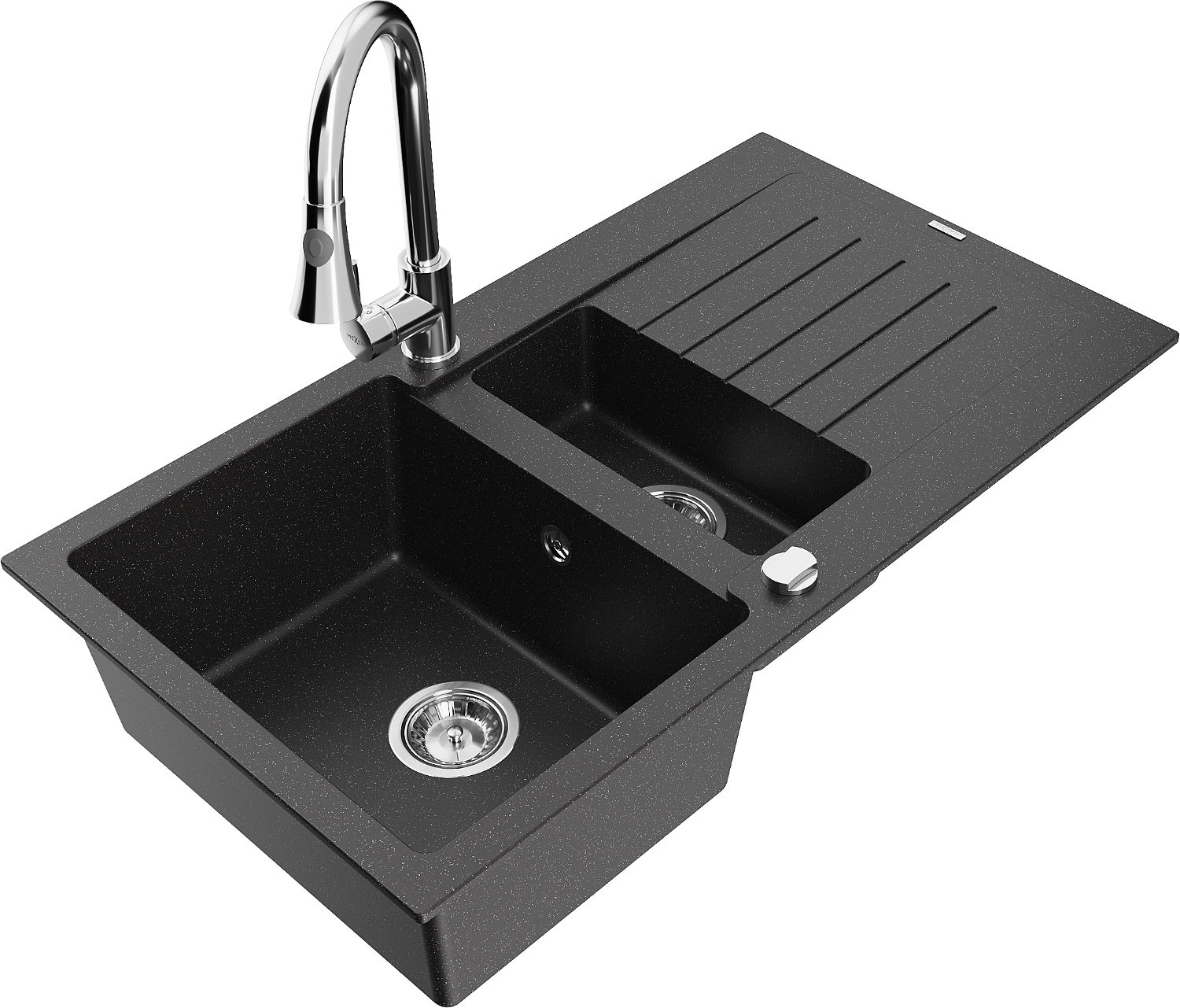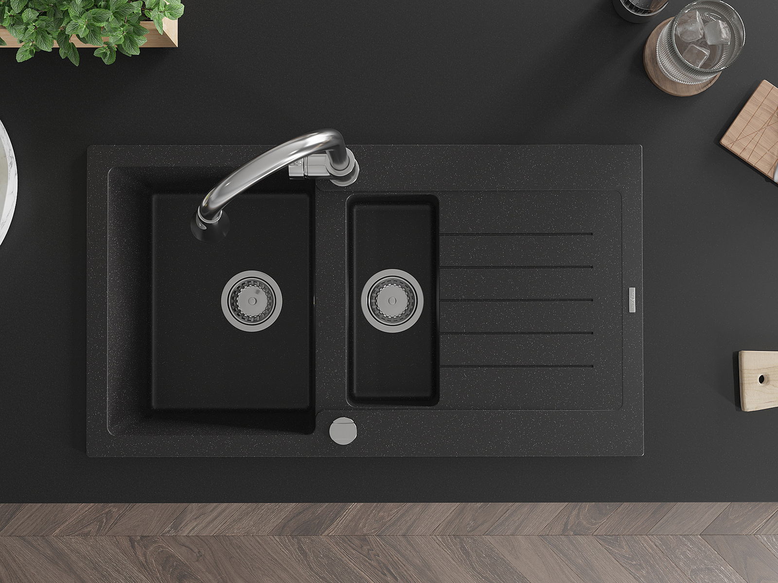 Mexen Matias évier en granit 1,5 bac avec égouttoir et robinet de cuisine Elia, noir/métallique argent - 6502-73-670101-00