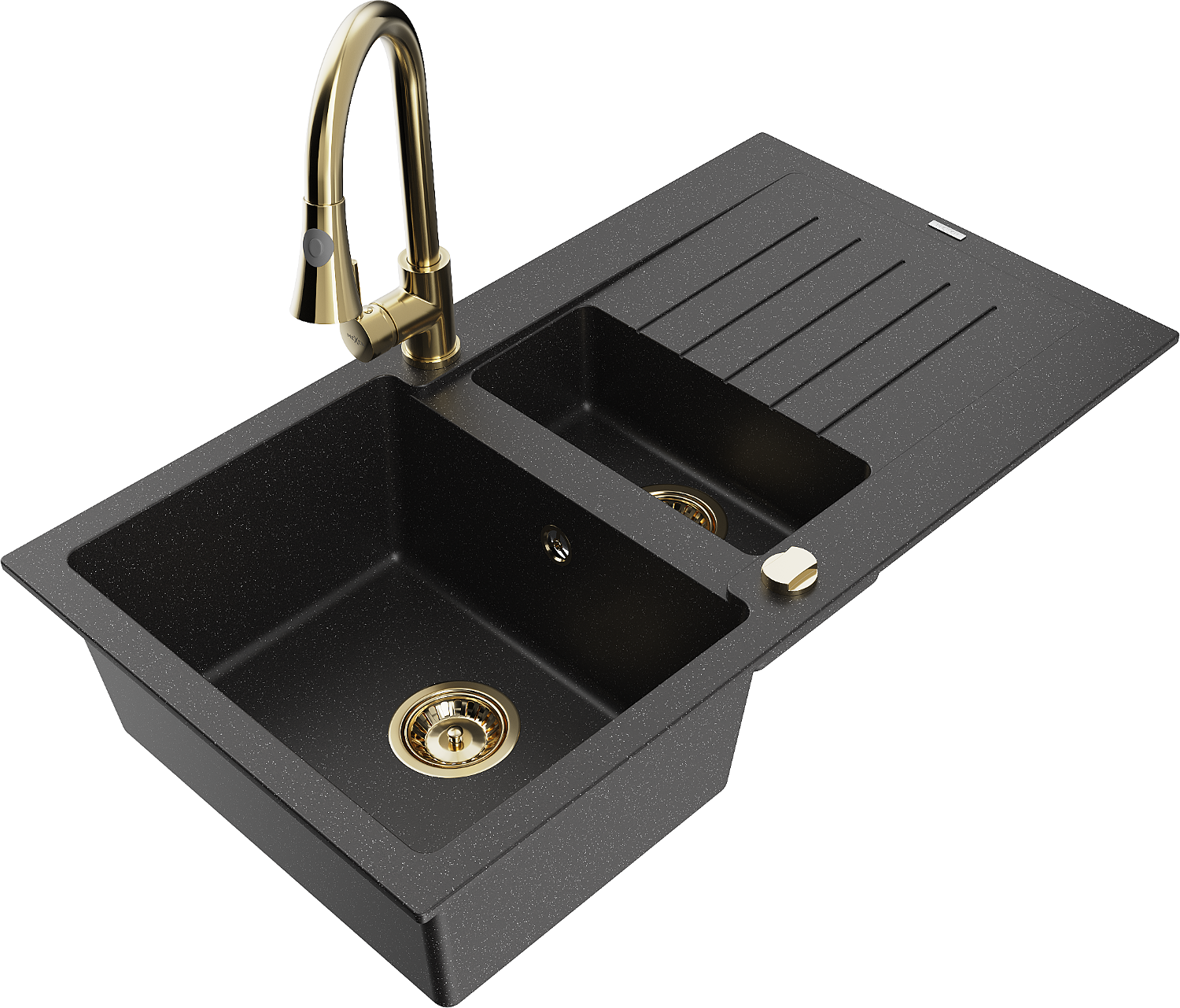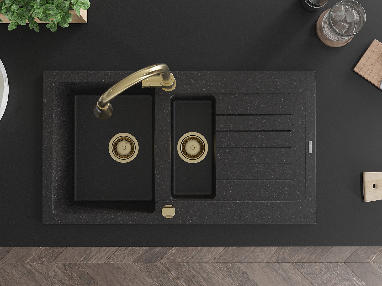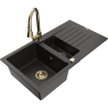 Mexen Matias évier en granit 1,5 bac avec égouttoir et robinet de cuisine Elia, noir/métallique argent - 6502-73-670101-50