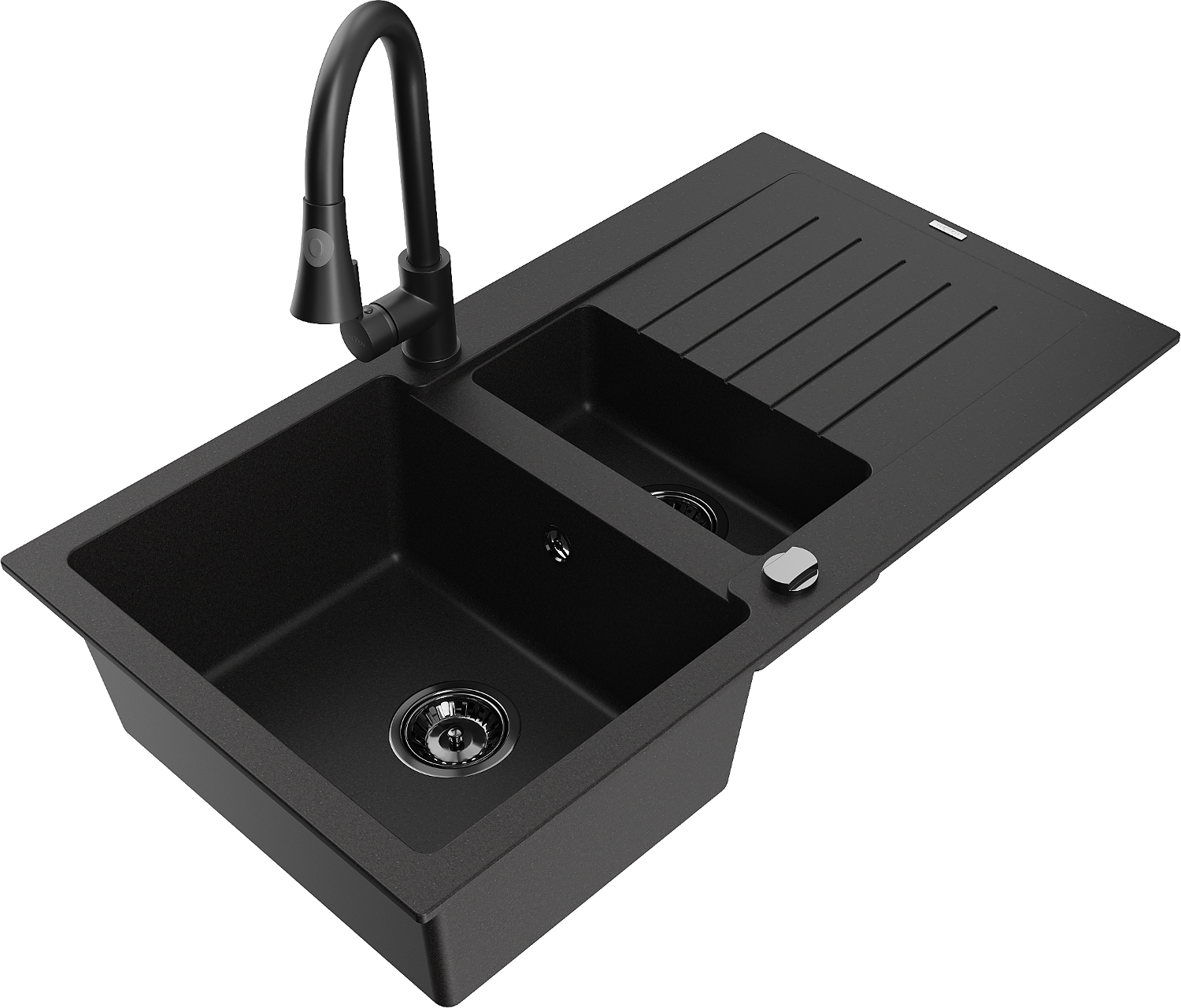 Mexen Matias évier en granit 1,5 bac avec égouttoir et mitigeur de cuisine Elia, noir - 6502-77-670101-70-B