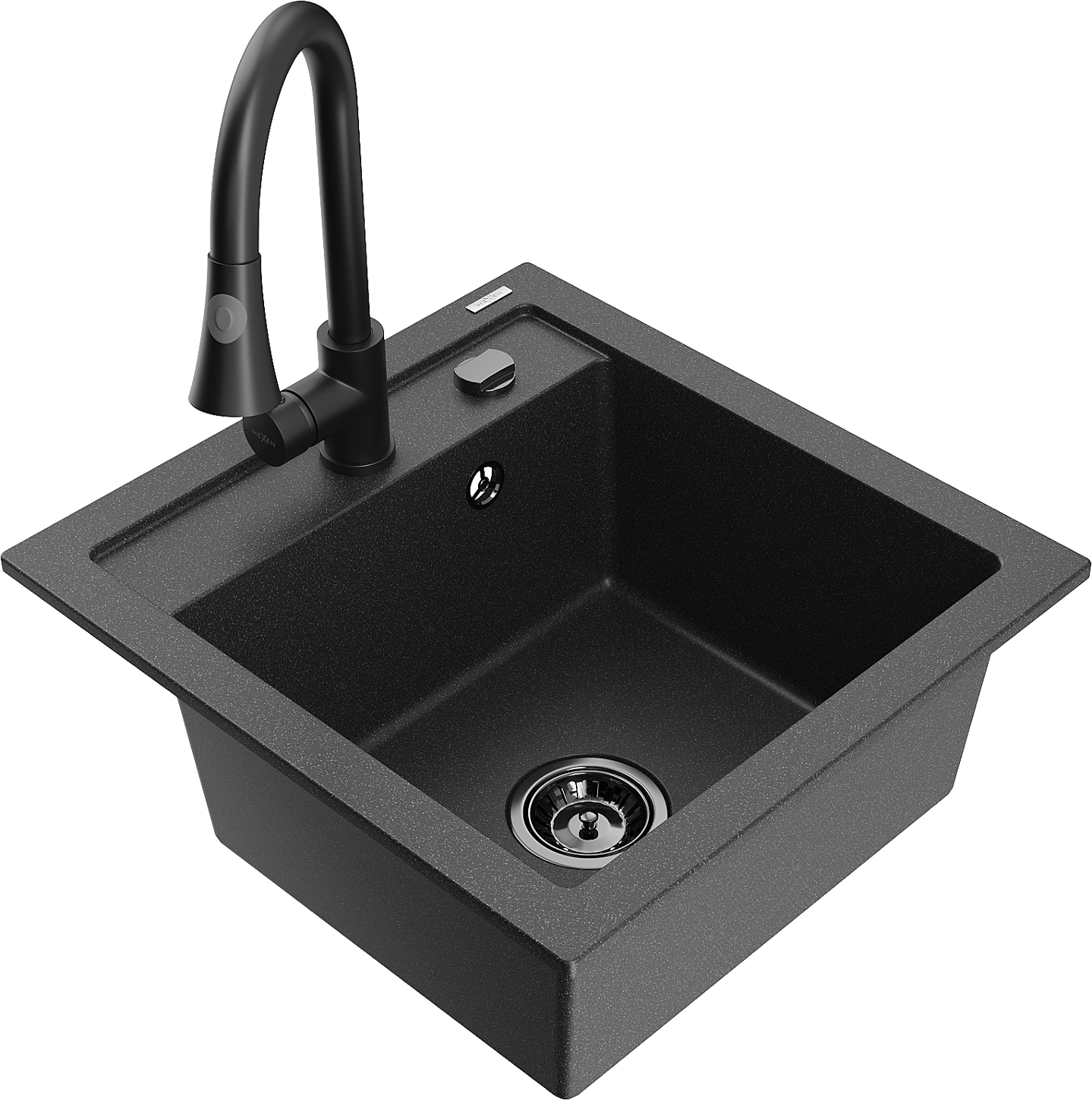 Mexen Vito évier de cuisine en granit à 1 bac avec mitigeur de cuisine Elia, noir moucheté - 6503-76-670101-70-B