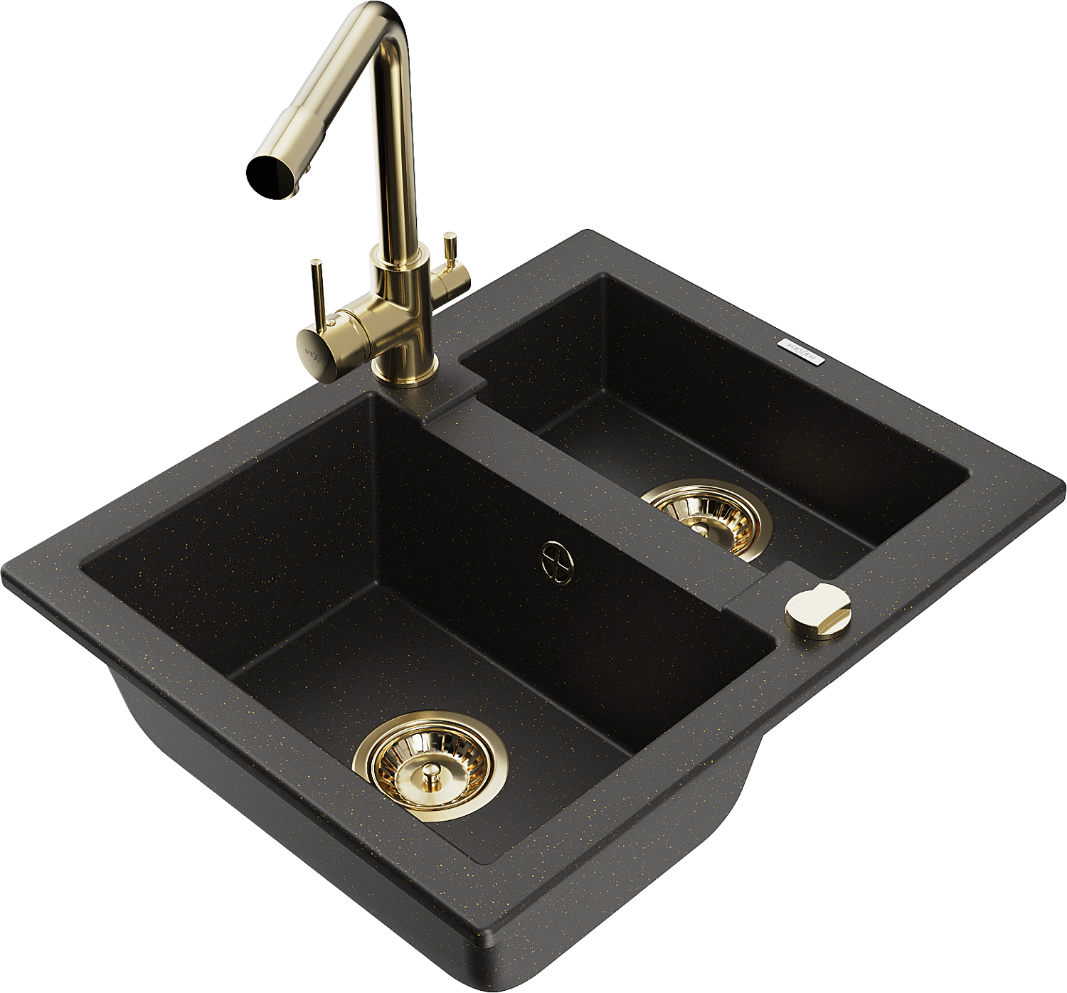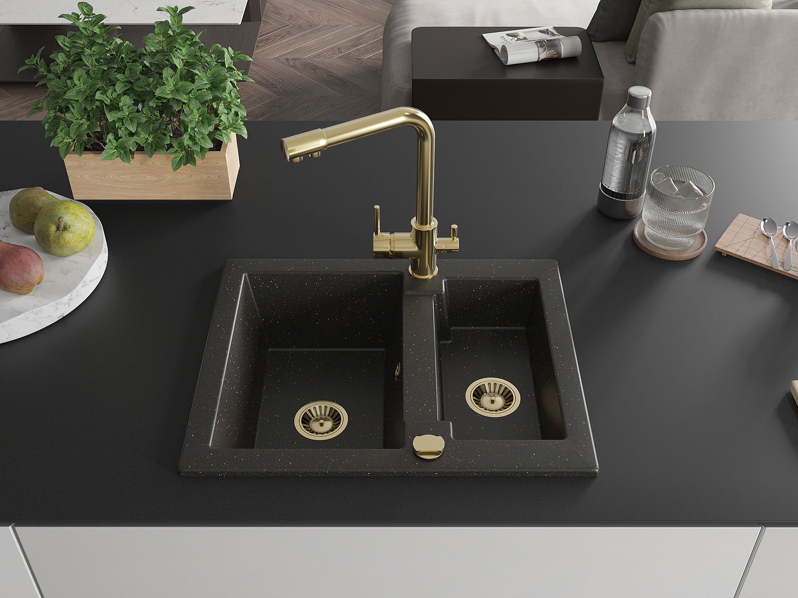 Mexen Carlos évier en granit 1,5 bac avec robinet de cuisine Duero, noir/doré métallique - 6518-75-671600-50