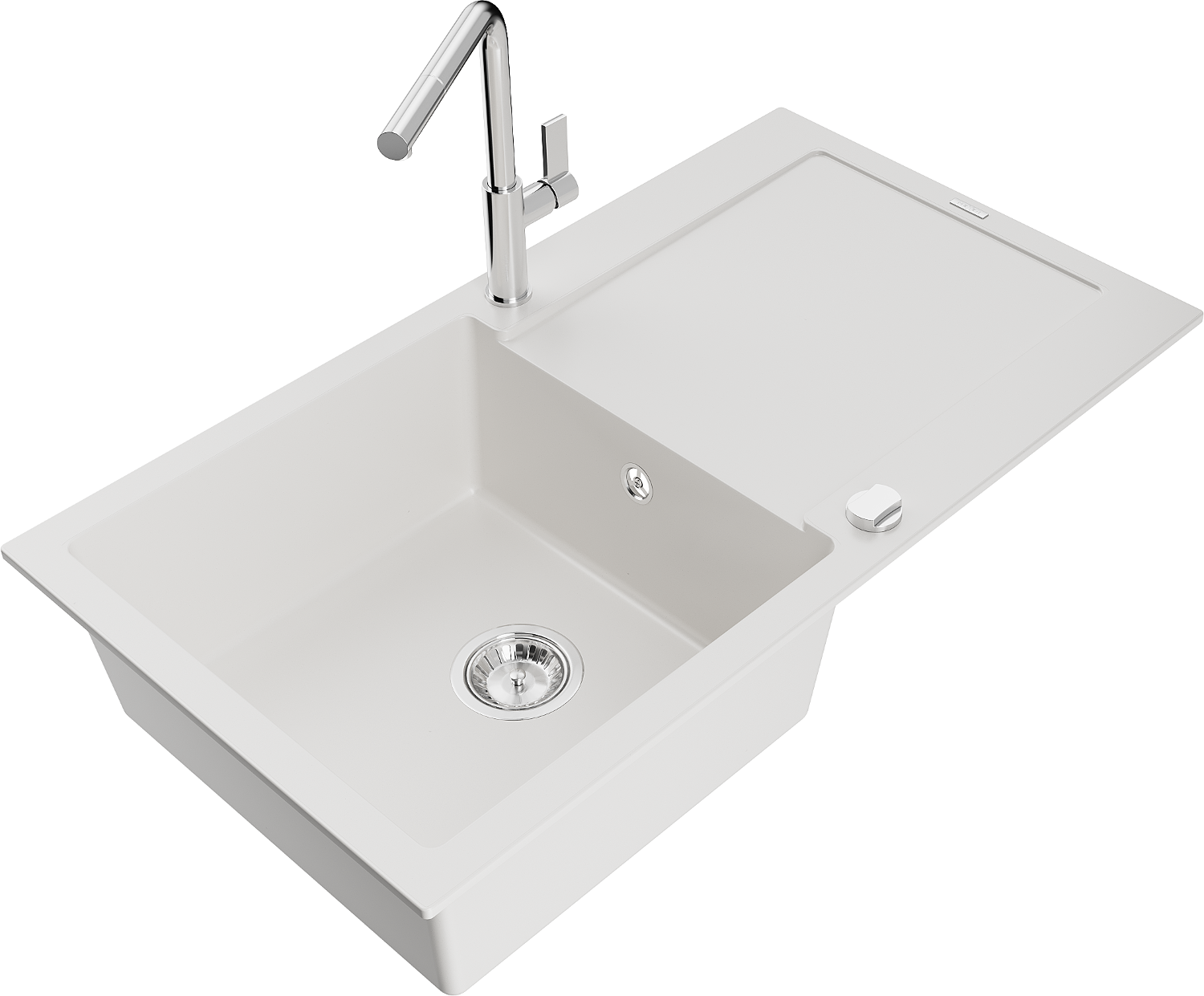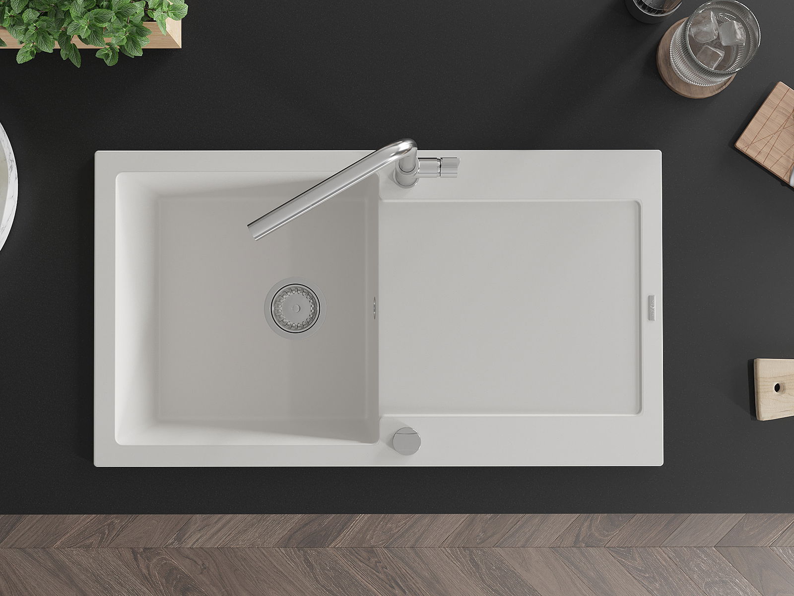 Mexen Leo évier en granit 1 bac avec égouttoir et robinet de cuisine Flora, blanc - 6501-20-670401-00