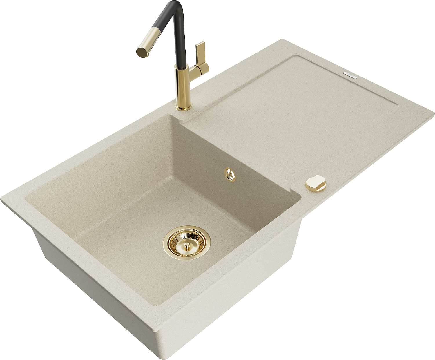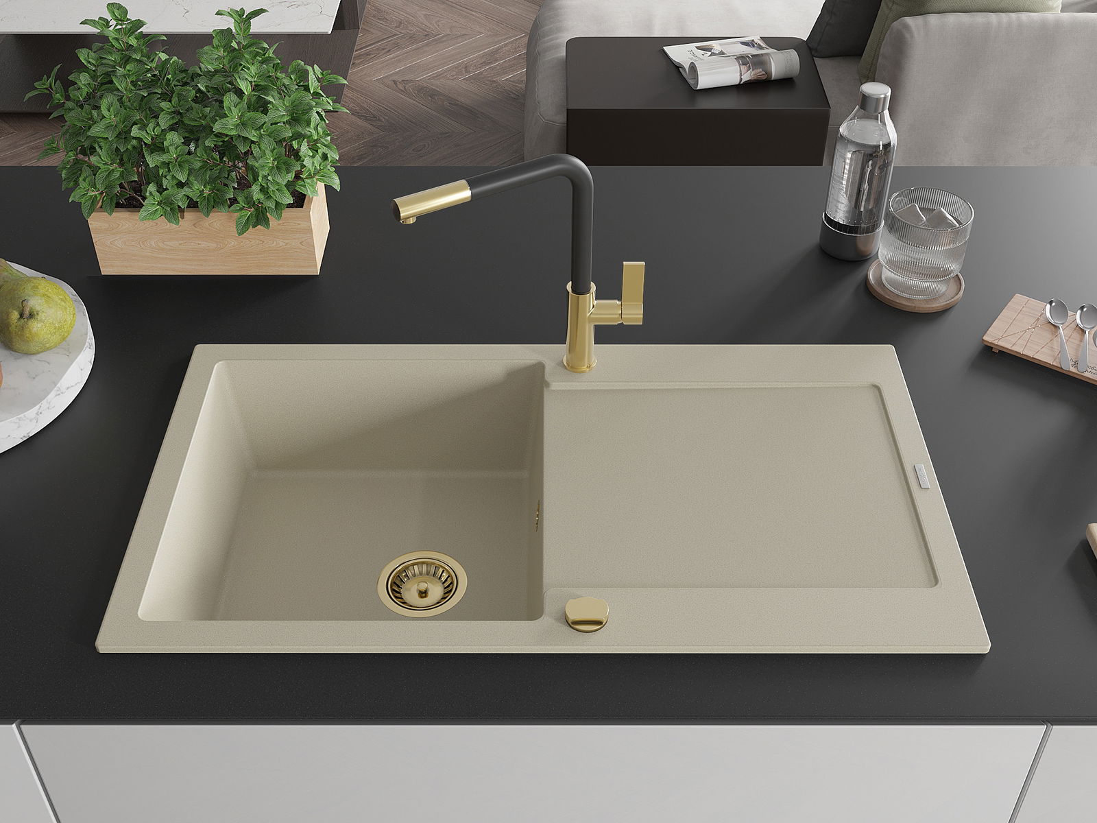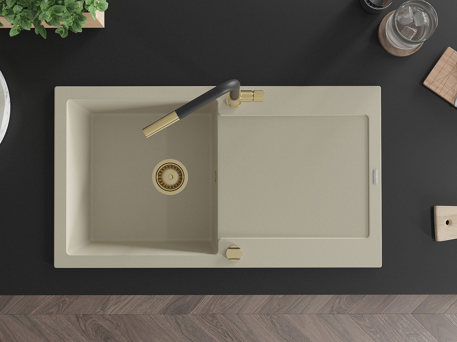 Mexen Leo évier de cuisine en granite à 1 bac avec égouttoir et robinet de cuisine Flora, beige - 6501-69-670401-57-G