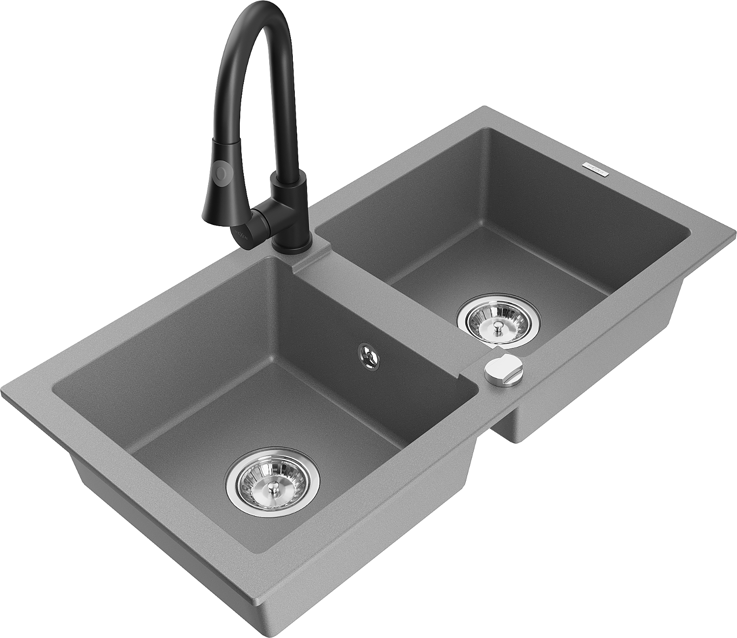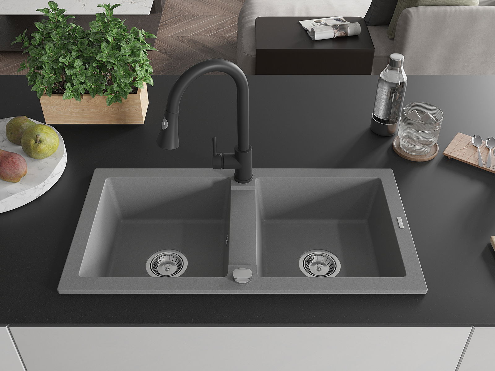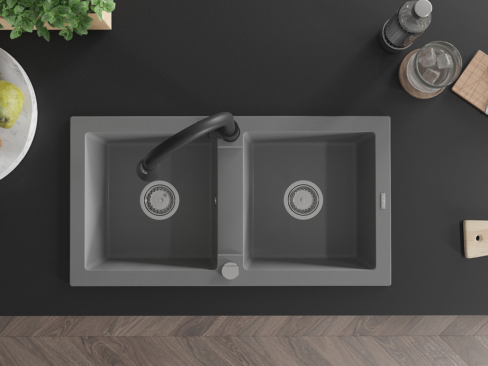 Mexen Mario évier de cuisine en granit à 2 bacs avec robinet de cuisine Elia, gris - 6504-71-670101-70