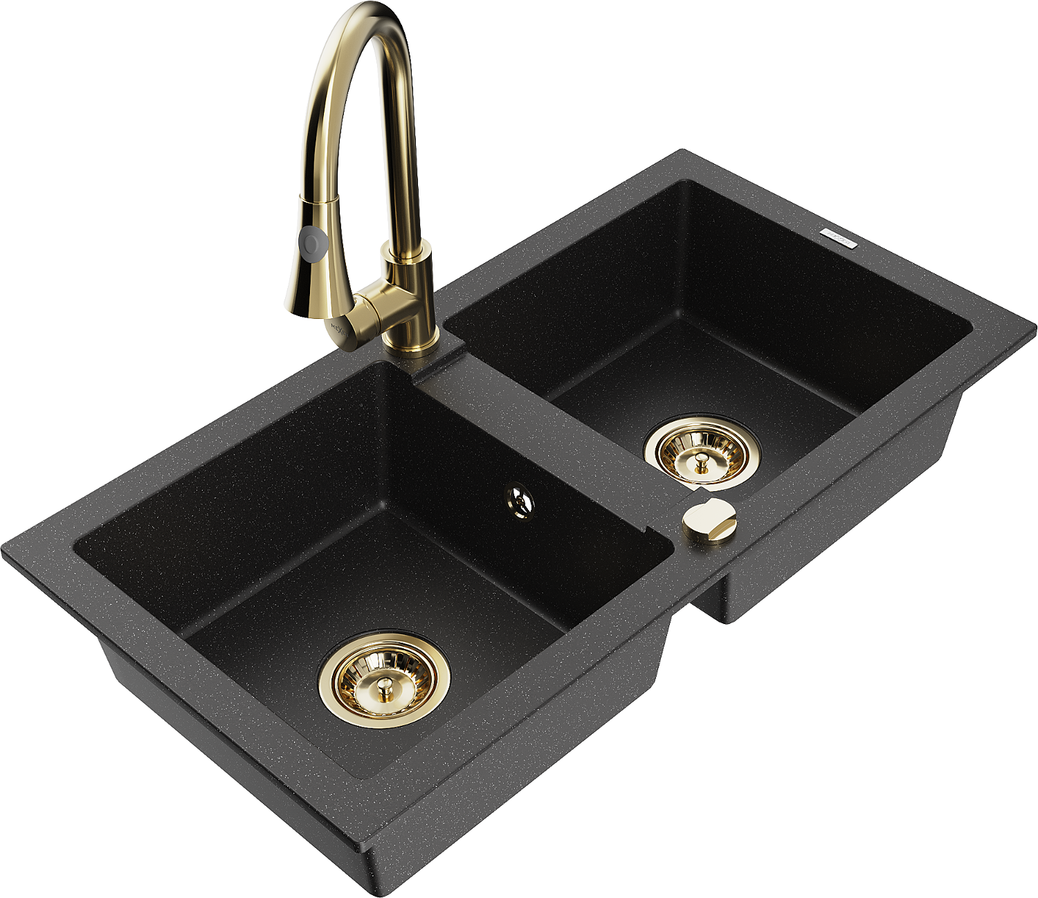 Mexen Mario évier en granit 2 bacs avec robinet de cuisine Elia, noir/métallisé argent - 6504-73-670101-50