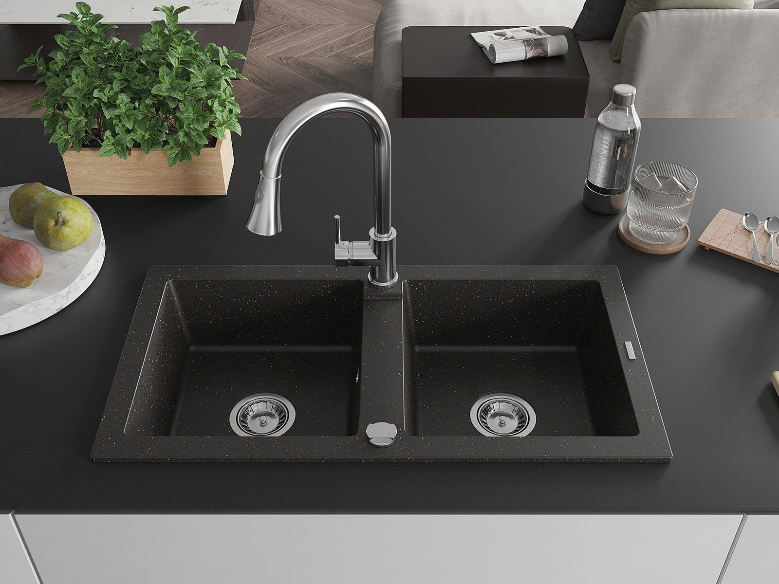 Mexen Mario évier en granit 2 bacs avec robinet de cuisine Elia, noir/or métallisé - 6504-75-670101-00