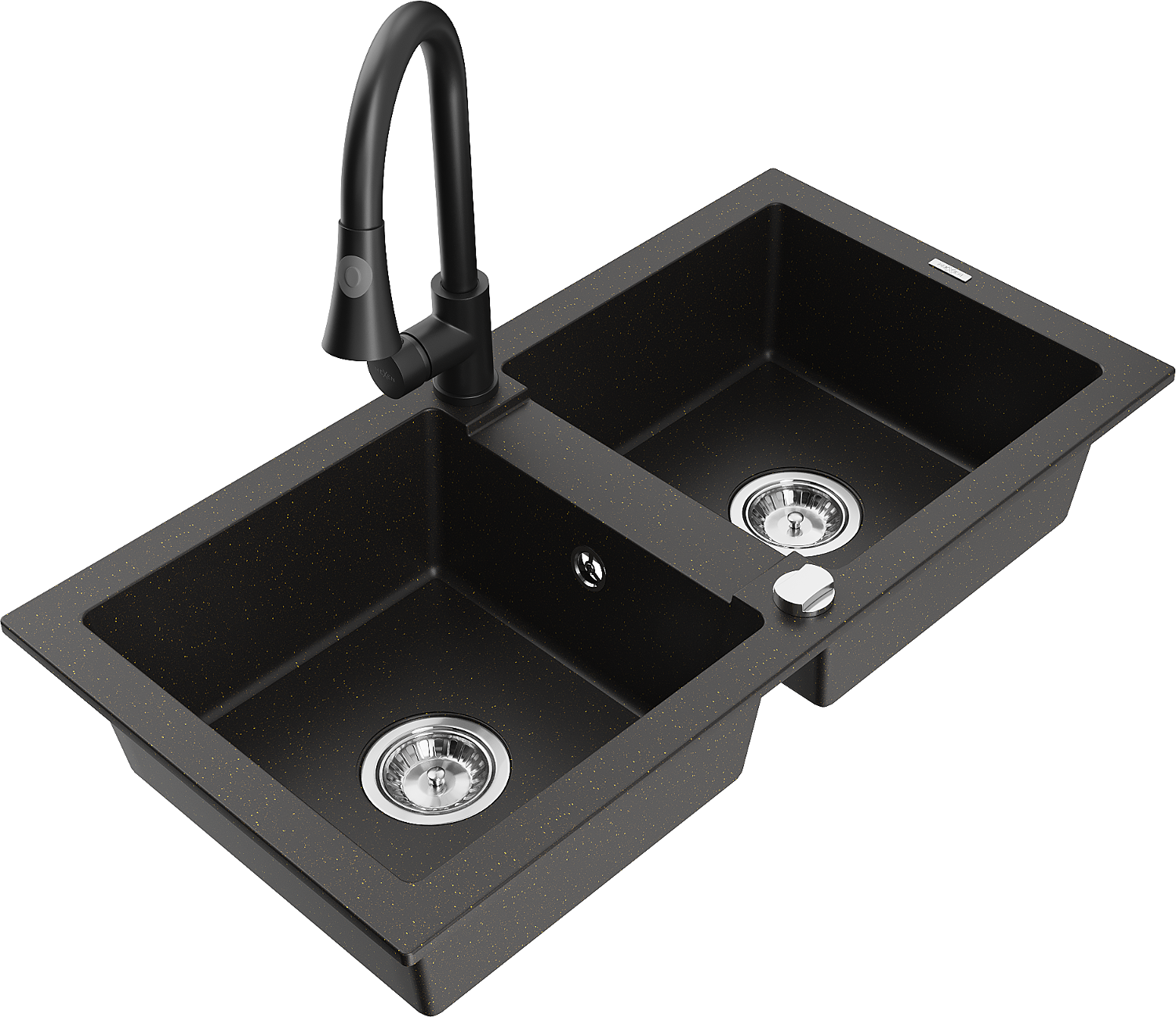 Mexen Mario évier en granit à 2 bacs avec robinet de cuisine Elia, noir/or métallique - 6504-75-670101-70