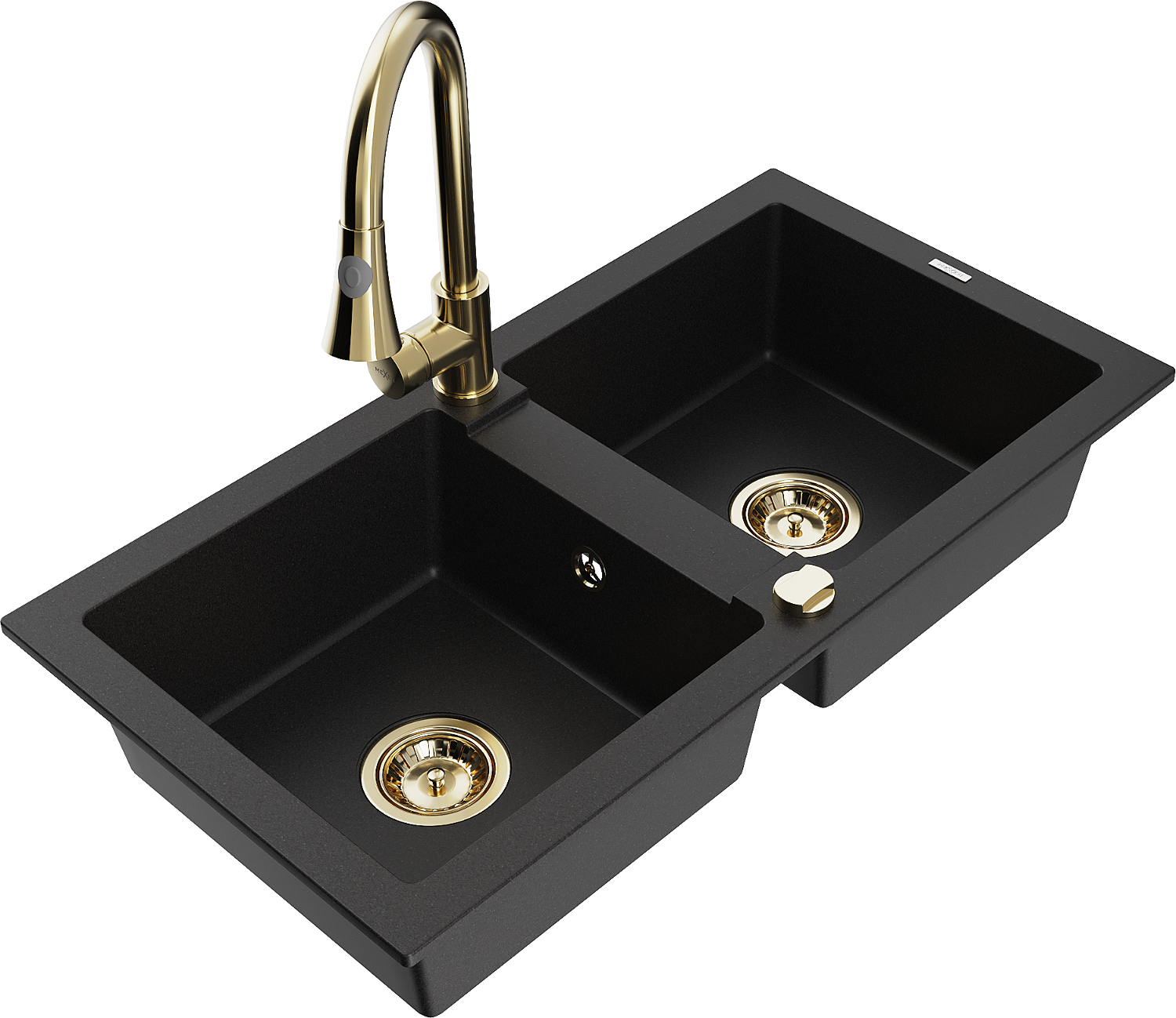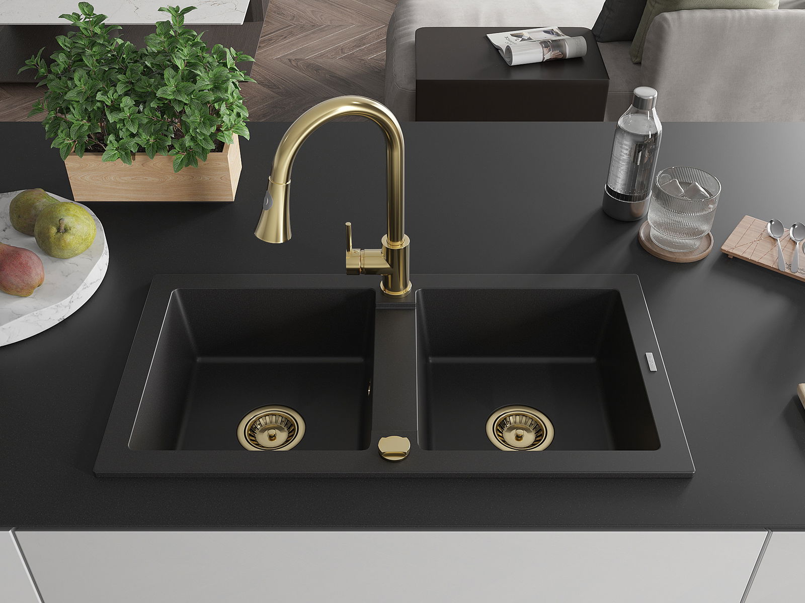 Mexen Mario évier de cuisine en granit à 2 cuves avec robinet de cuisine Elia, noir - 6504-77-670101-50
