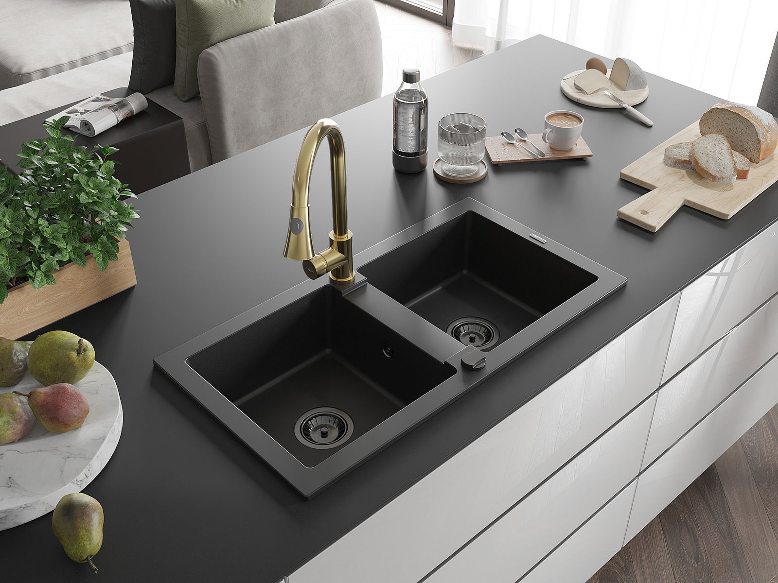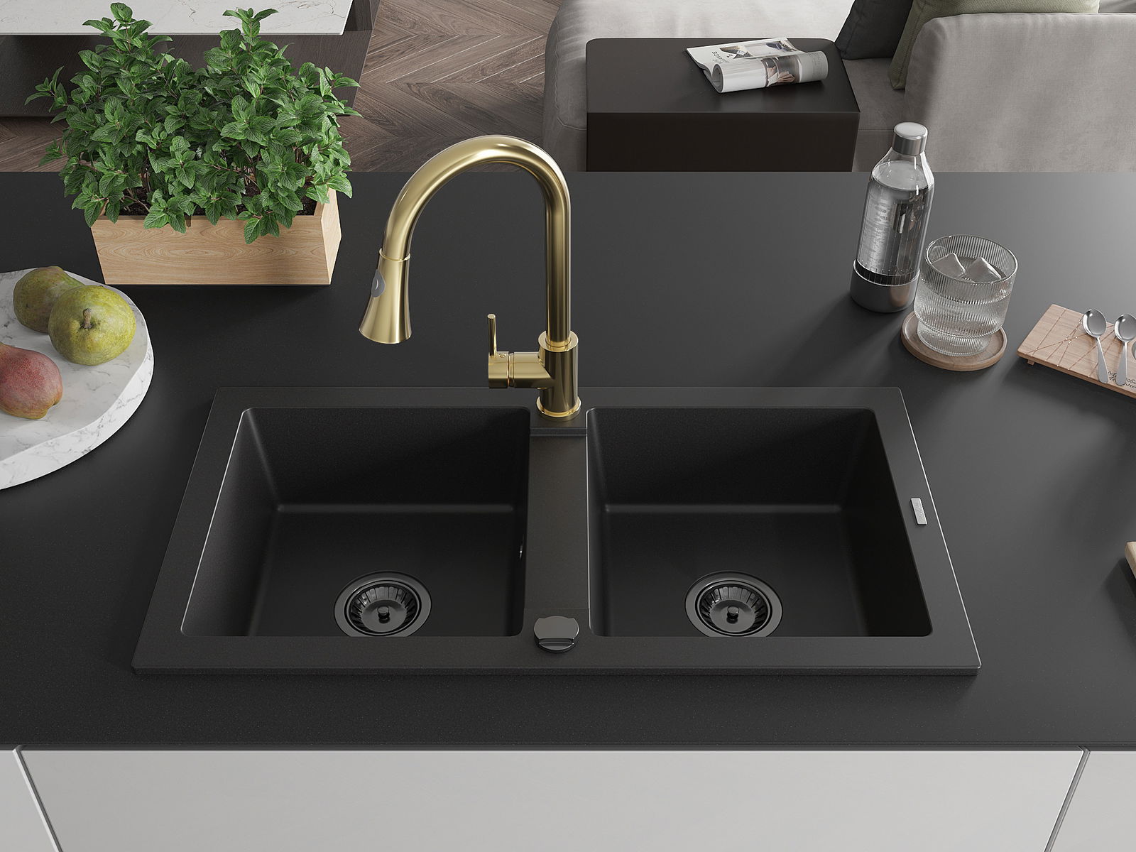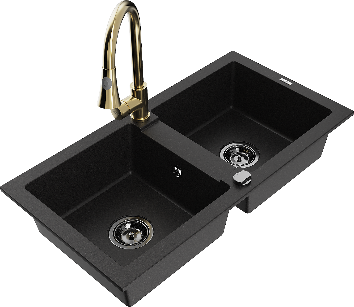 Mexen Mario évier en granit à 2 bacs avec robinet de cuisine Elia, noir - 6504-77-670101-50-B