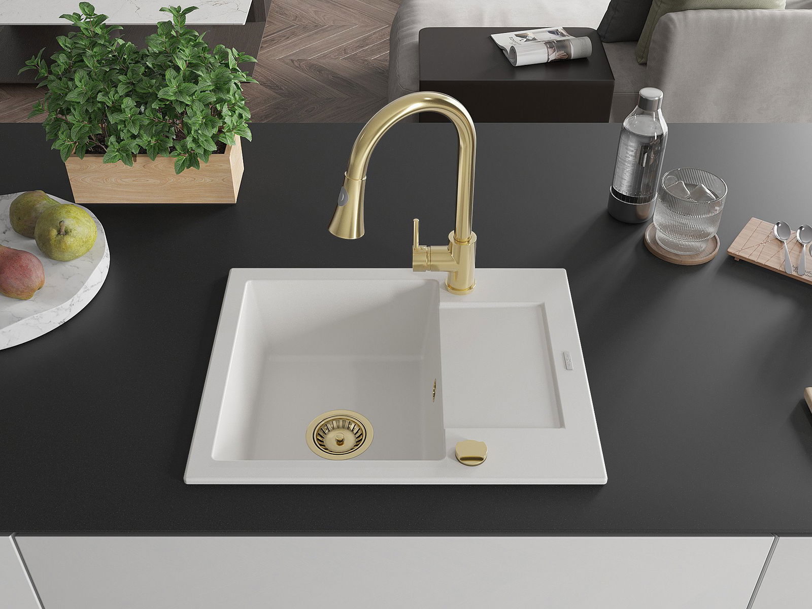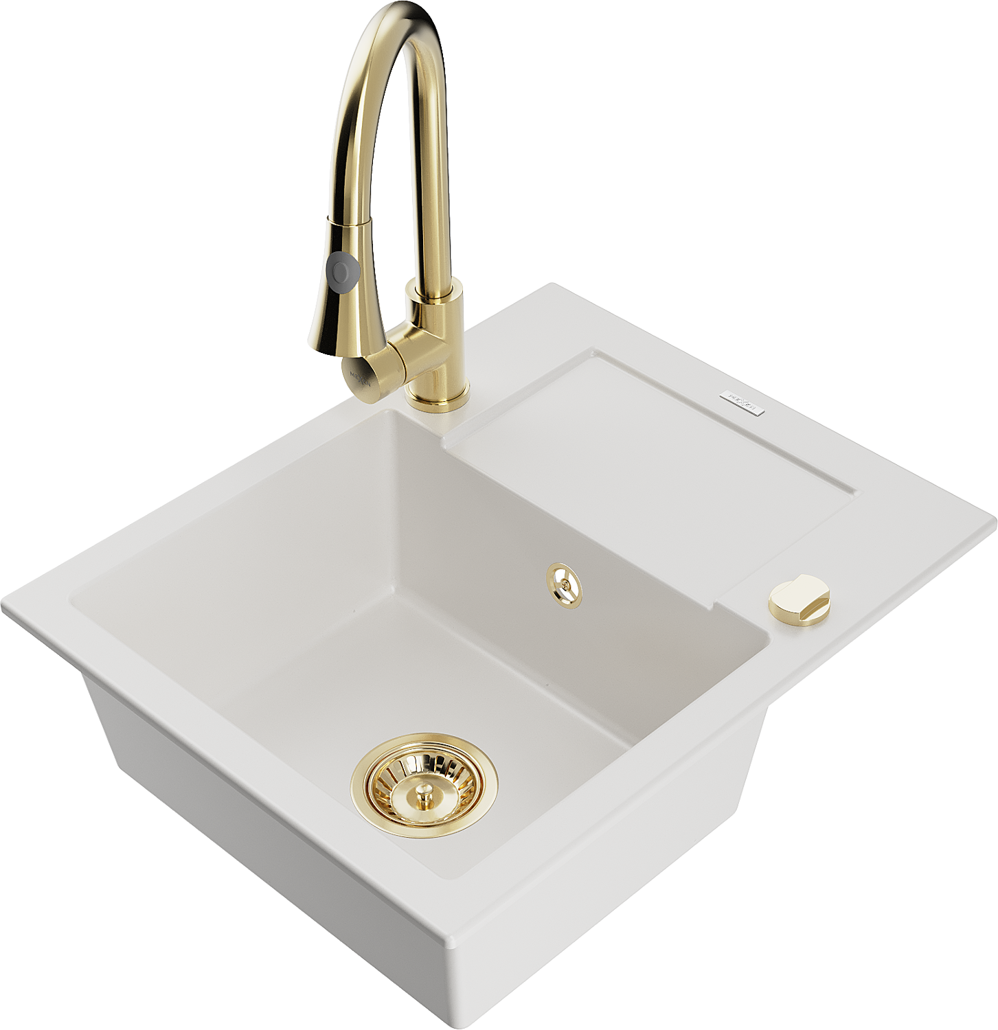 Mexen Enzo évier de cuisine en granit 1 bac avec égouttoir et robinet de cuisine Elia, blanc - 6506-20-670101-50