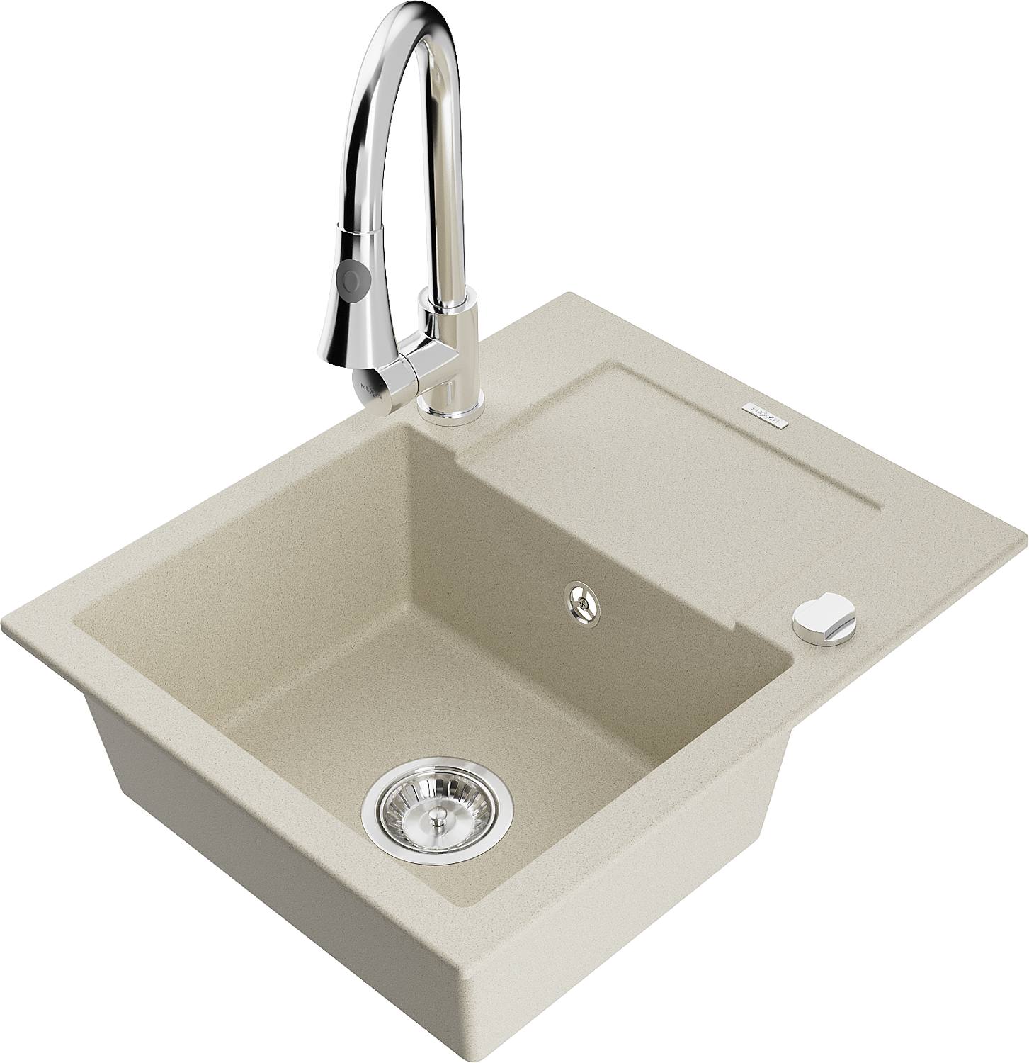 Mexen Enzo évier en granit 1 bac avec égouttoir et robinet de cuisine Elia, beige - 6506-69-670101-00