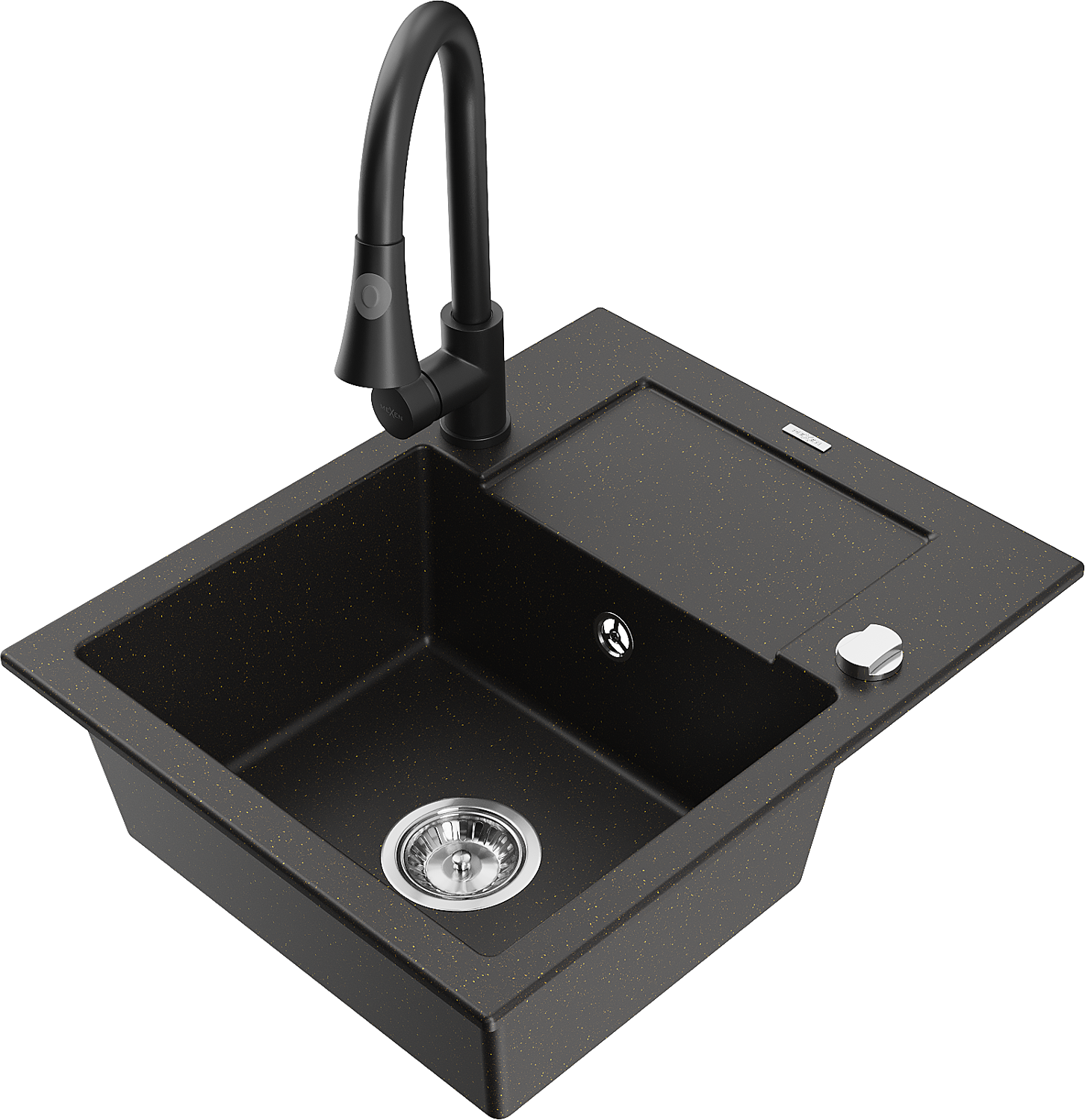 Mexen Enzo évier en granit 1 bac avec égouttoir et robinet de cuisine Elia, noir/doré métallisé - 6506-75-670101-70