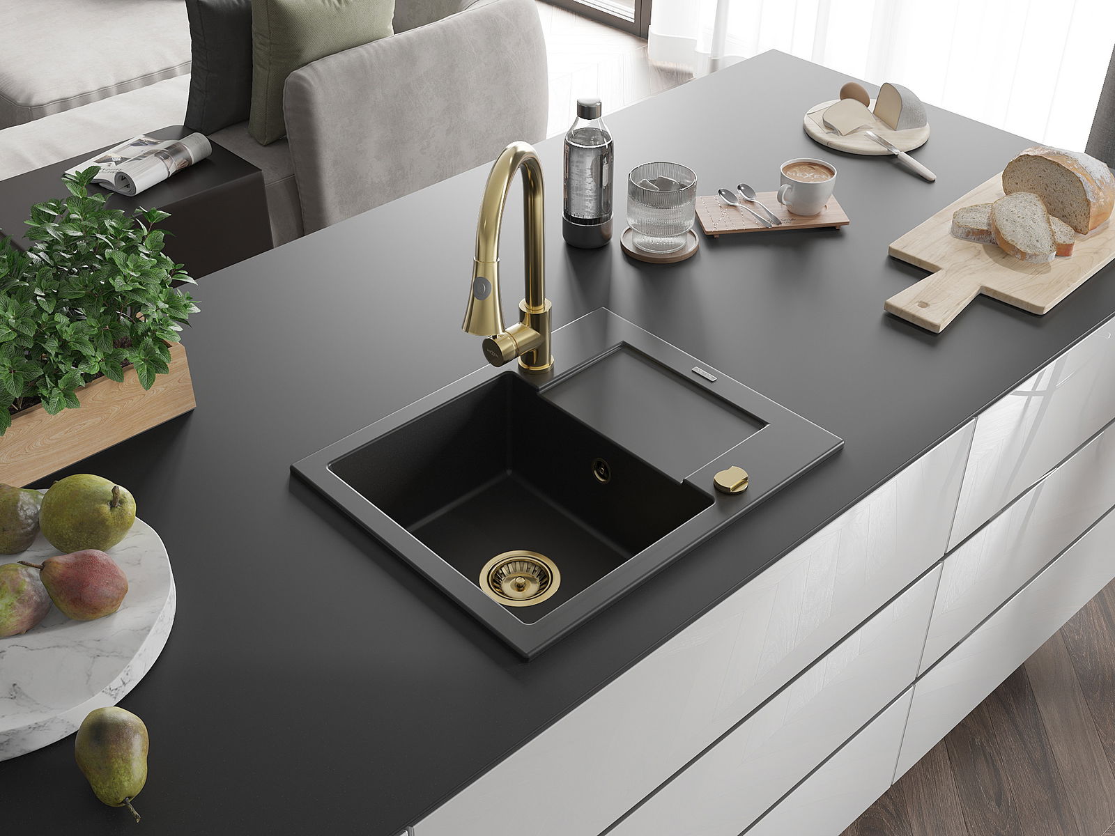 Mexen Enzo évier en granit 1 bac avec égouttoir et mitigeur cuisine Elia, noir - 6506-77-670101-50