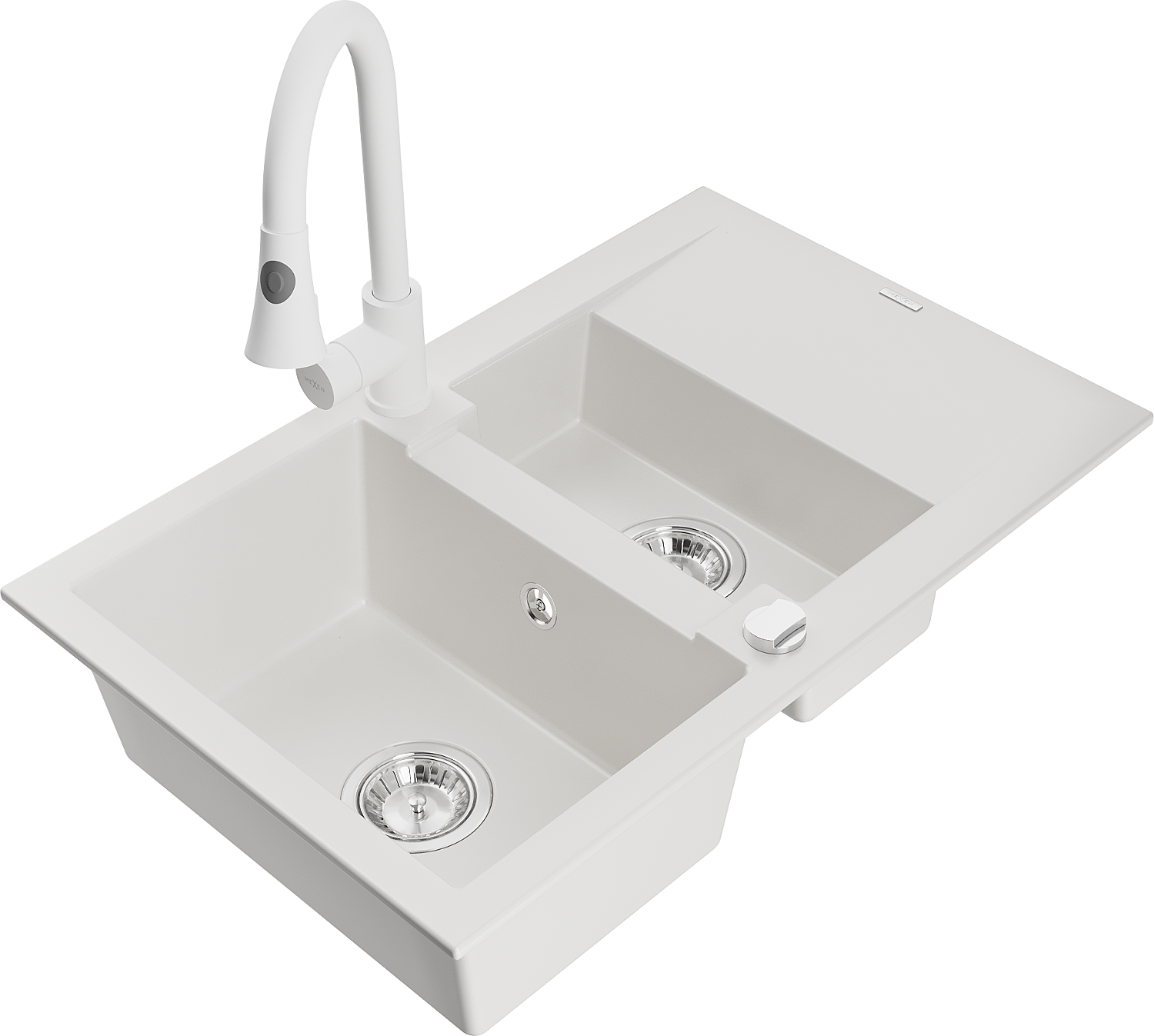 Mexen Gaspar évier en granit 1,5 bac avec égouttoir et robinet de cuisine Elia, blanc - 6507-20-670101-20