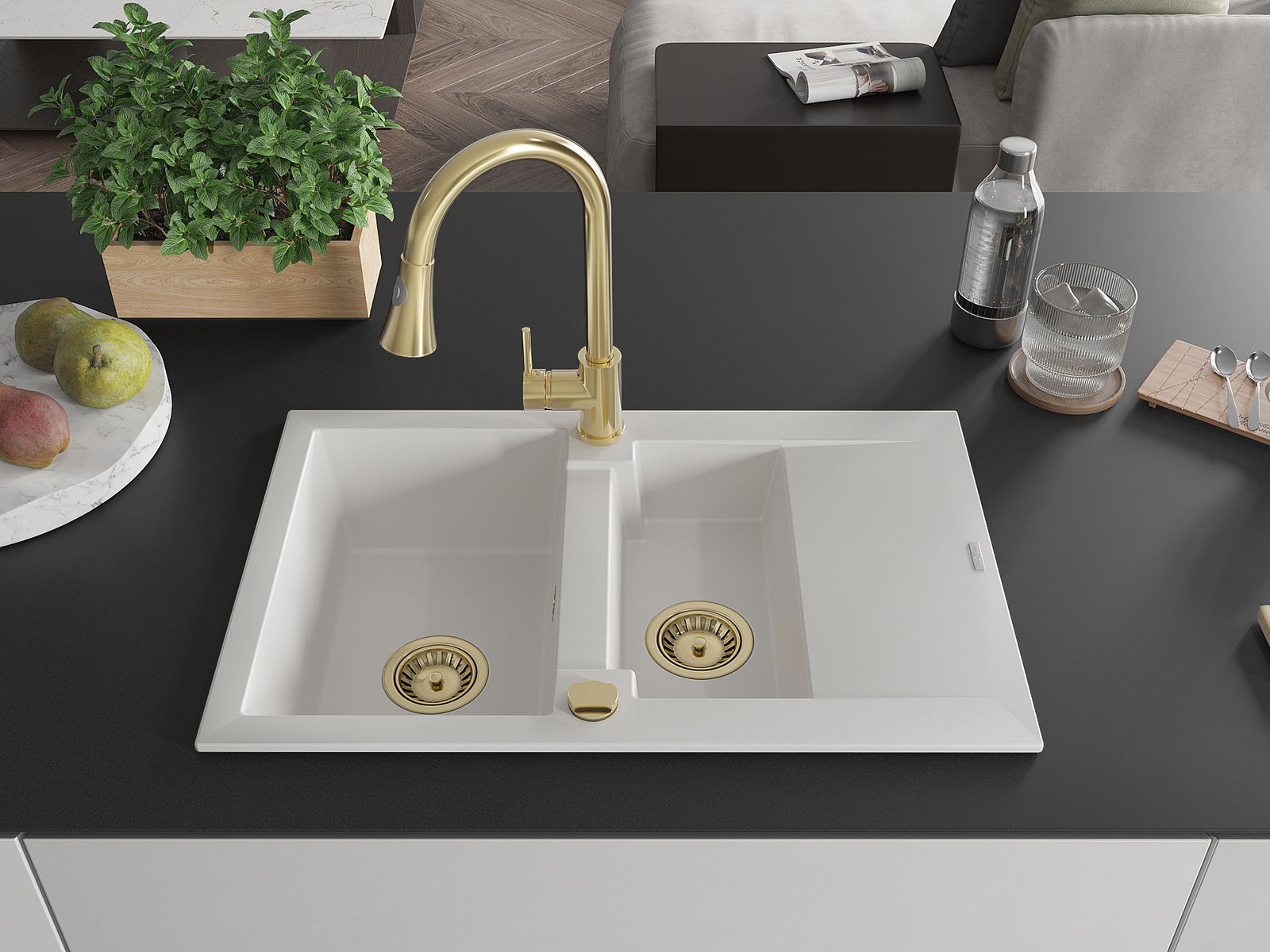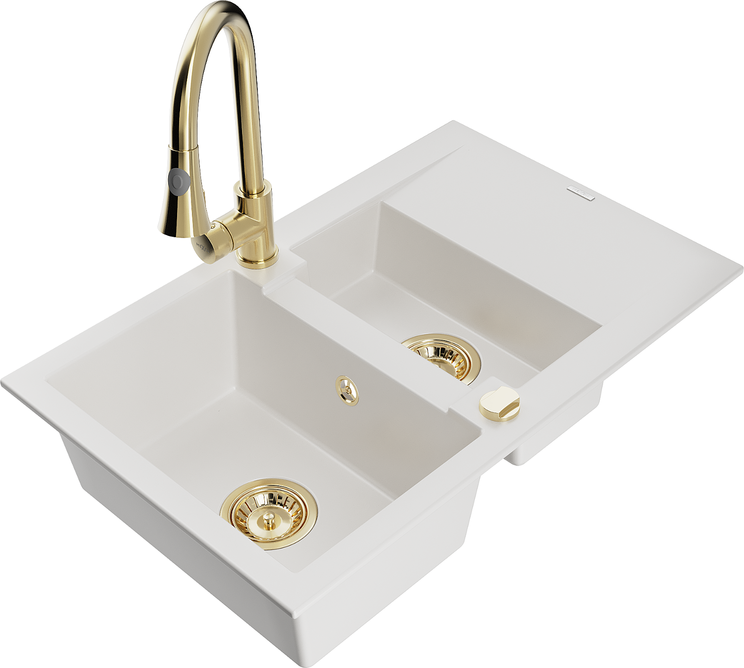 Mexen Gaspar évier en granit 1,5 bassins avec égouttoir et robinet de cuisine Elia, blanc - 6507-20-670101-50