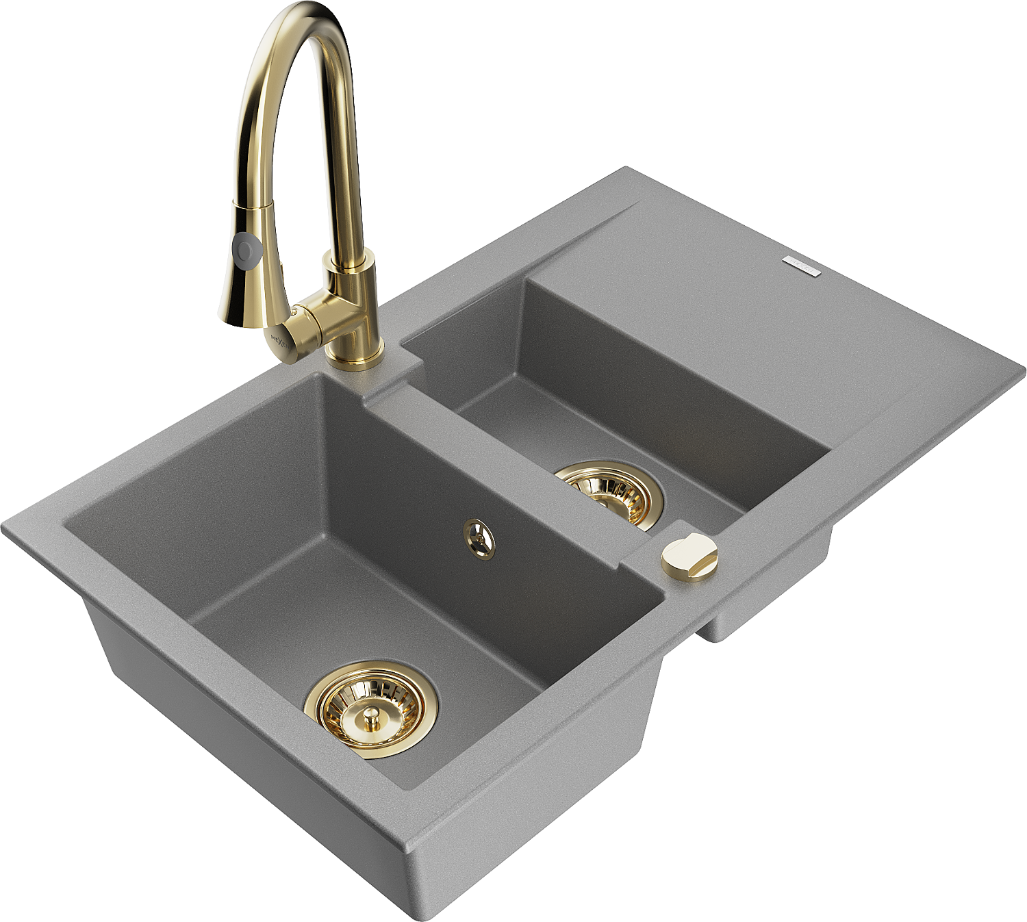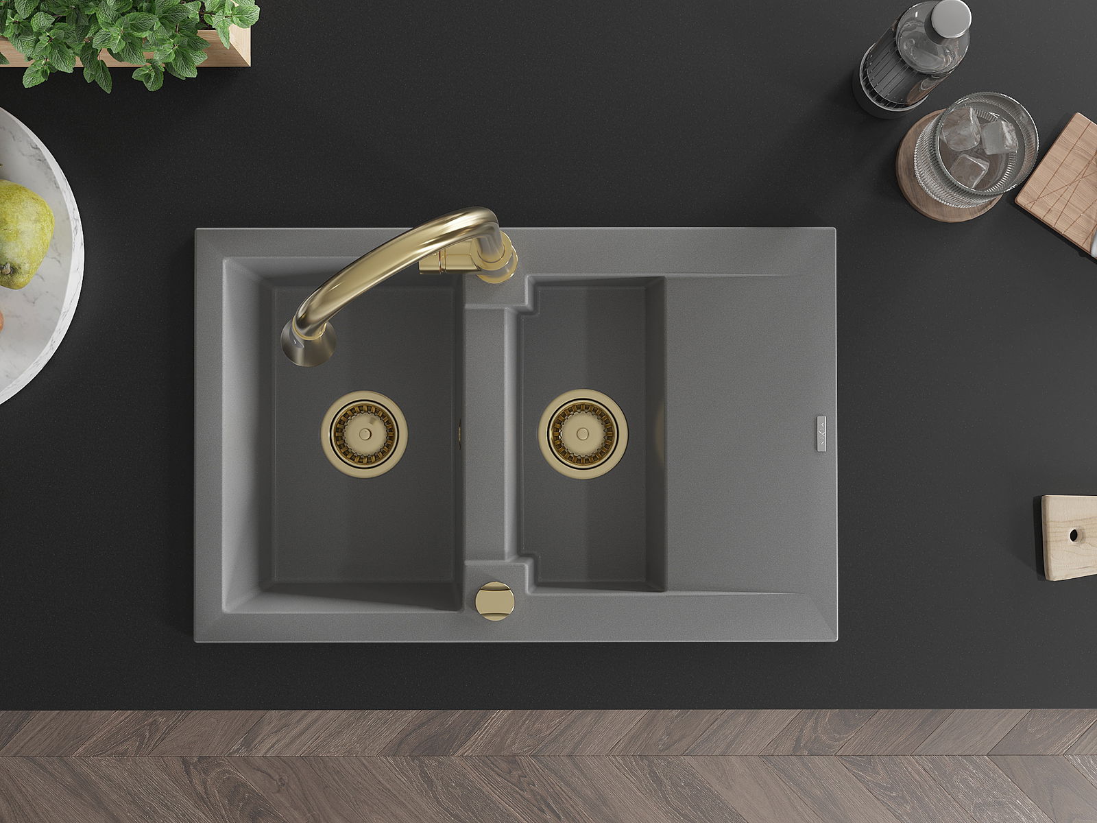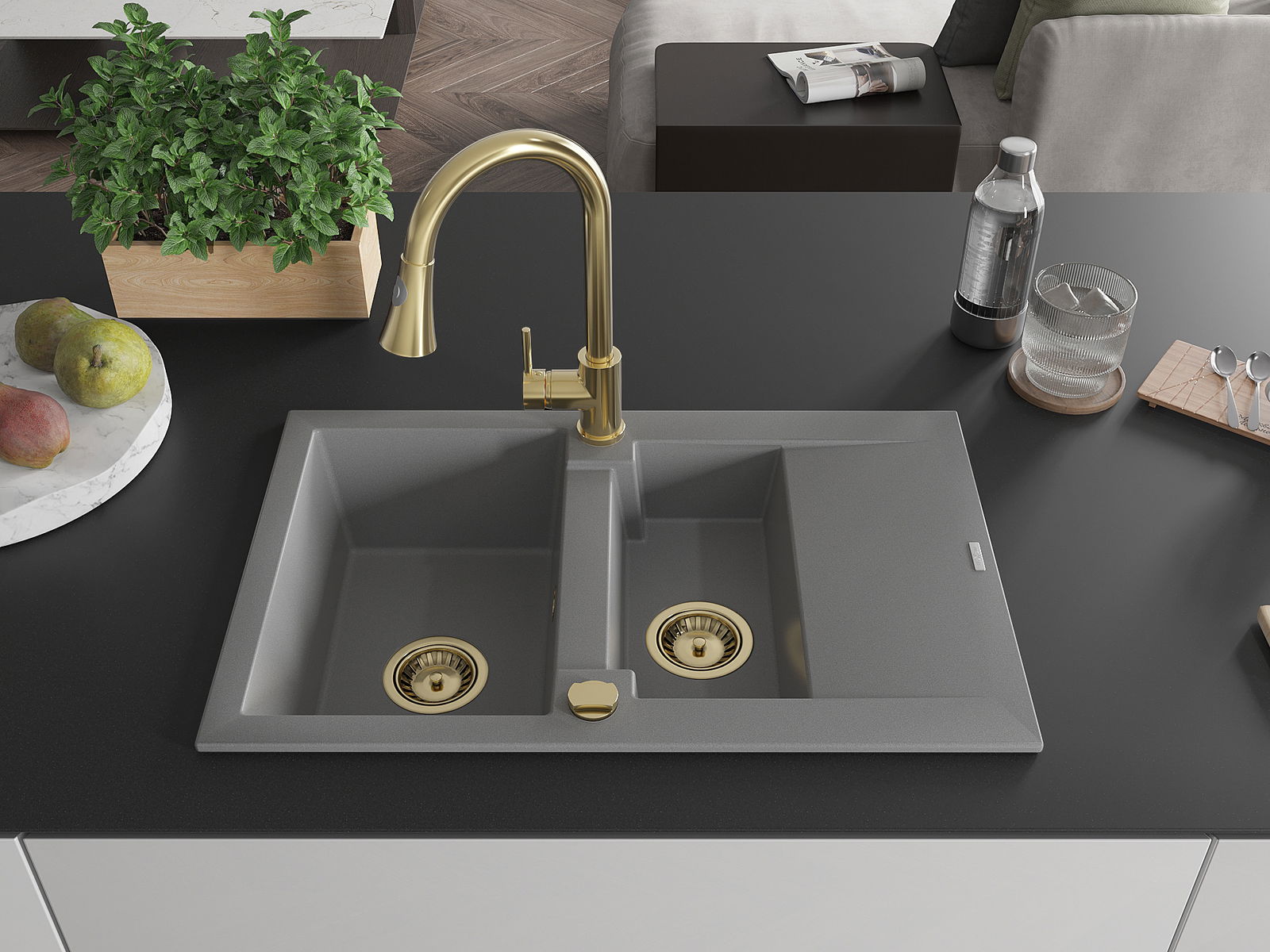 Mexen Gaspar évier en granit 1,5 bac avec égouttoir et mitigeur de cuisine Elia, gris - 6507-71-670101-50