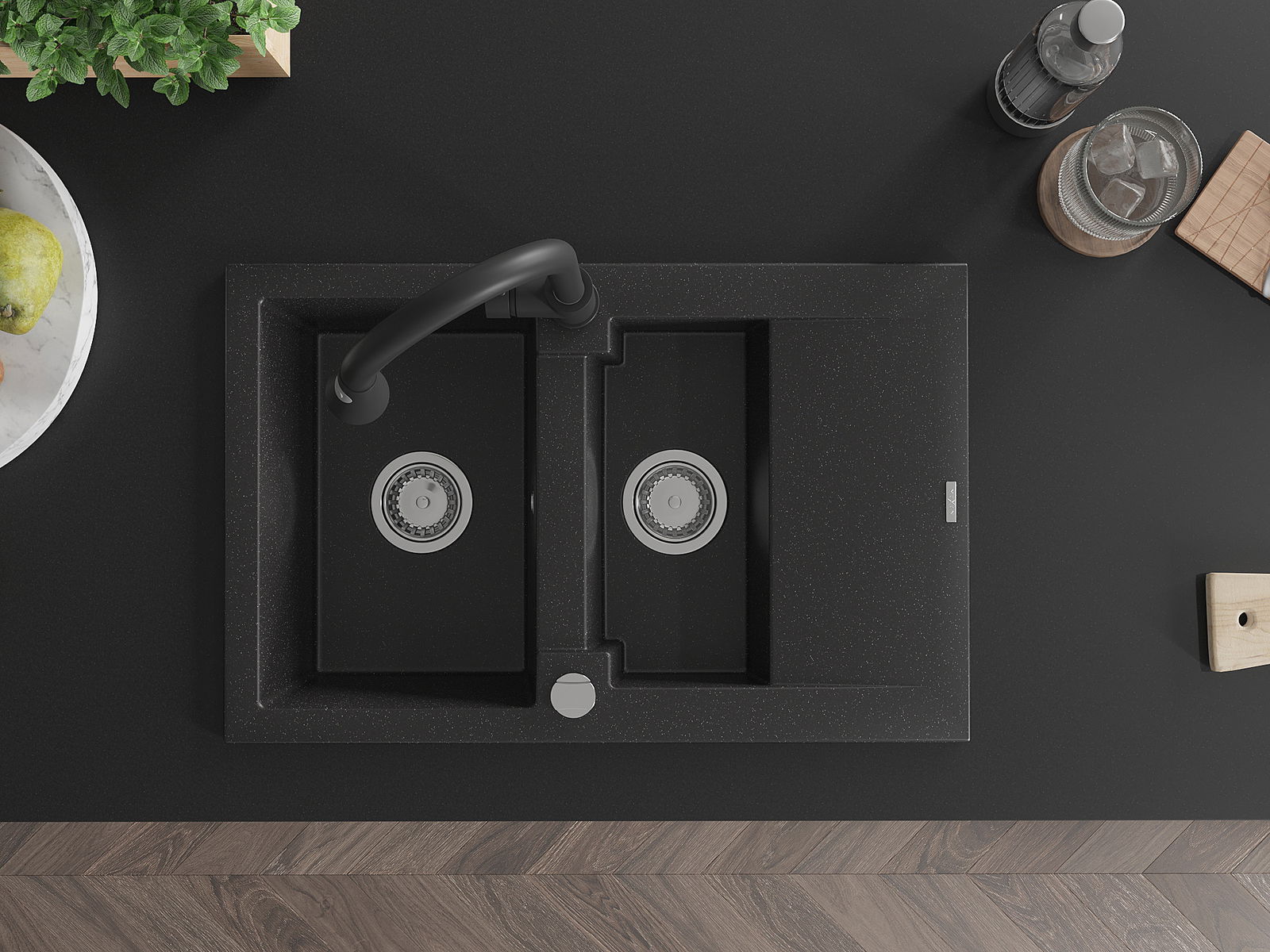 Mexen Gaspar évier en granit 1,5 bac avec égouttoir et robinet de cuisine Elia, noir/argent métallisé - 6507-73-670101-70