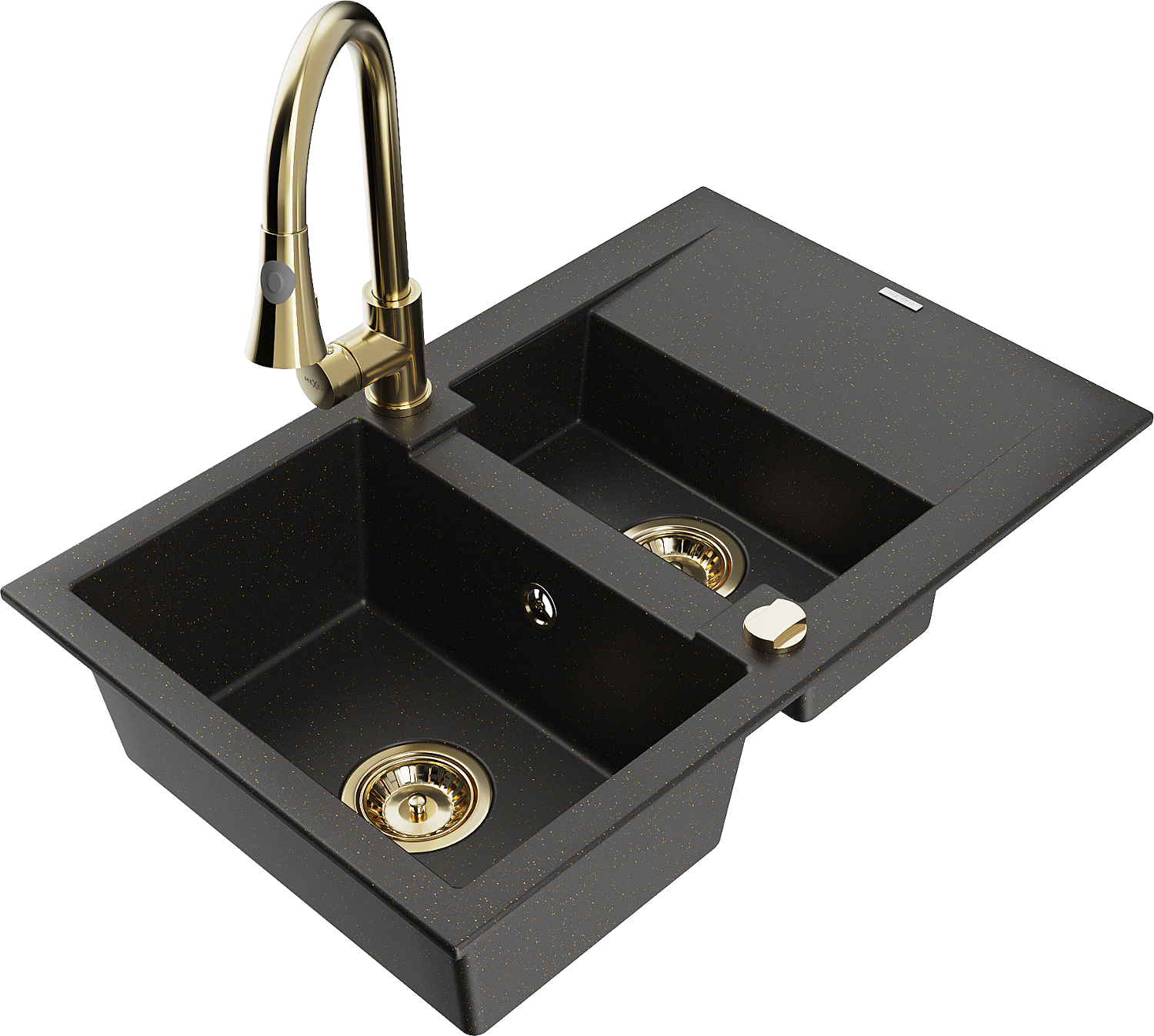 Mexen Gaspar évier en granit 1,5 cuve avec égouttoir et robinet de cuisine Elia, noir/or métallique - 6507-75-670101-50
