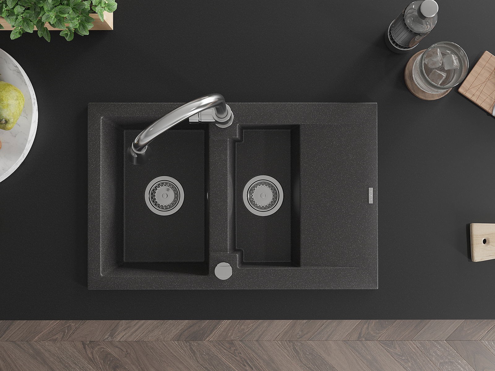 Mexen Gaspar évier en granit 1,5 bac avec égouttoir et robinet de cuisine Elia, noir avec éclaboussures - 6507-76-670101-00