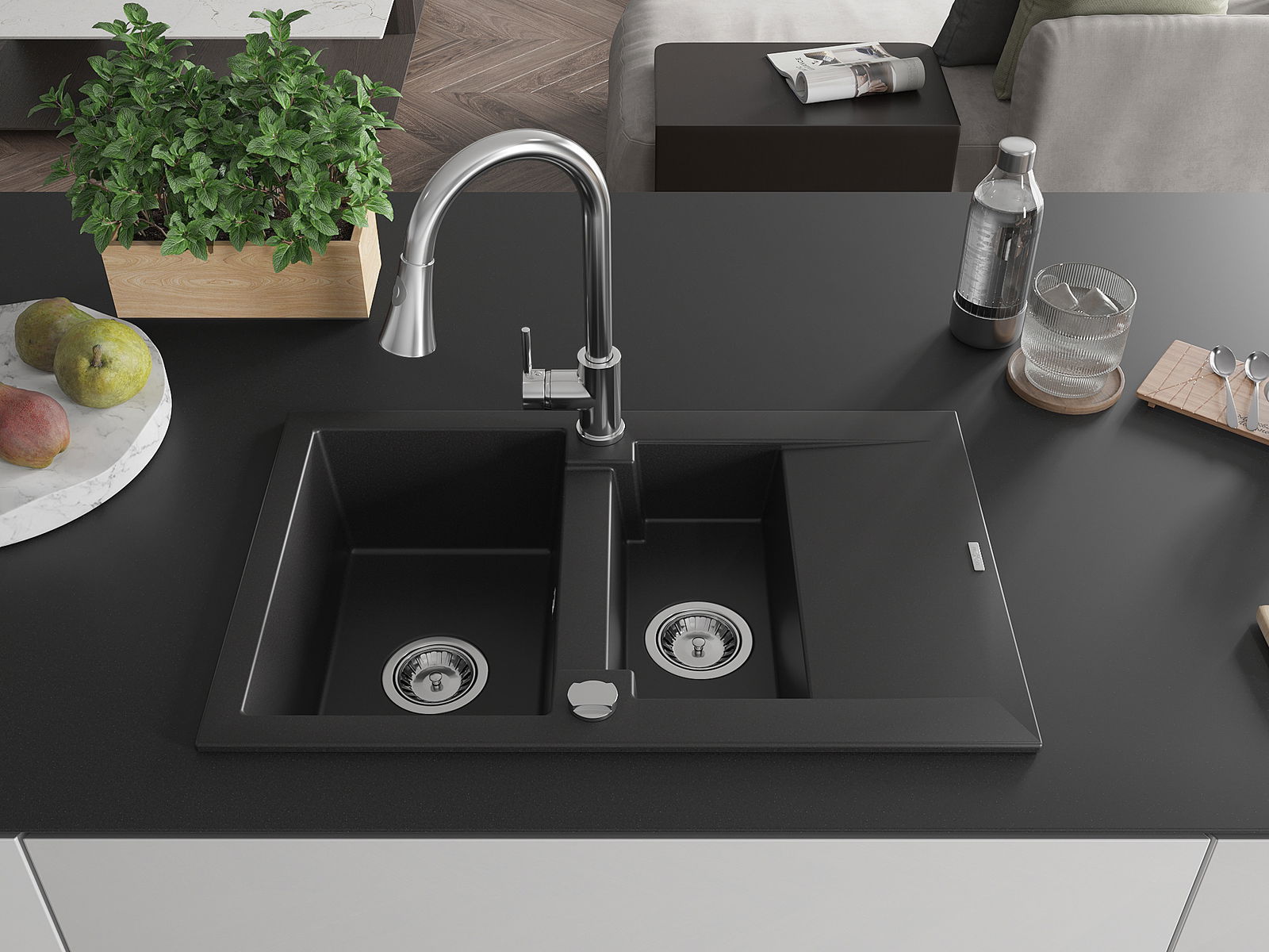 Mexen Gaspar évier en granit 1,5 cuve avec égouttoir et mitigeur de cuisine Elia, noir - 6507-77-670101-00